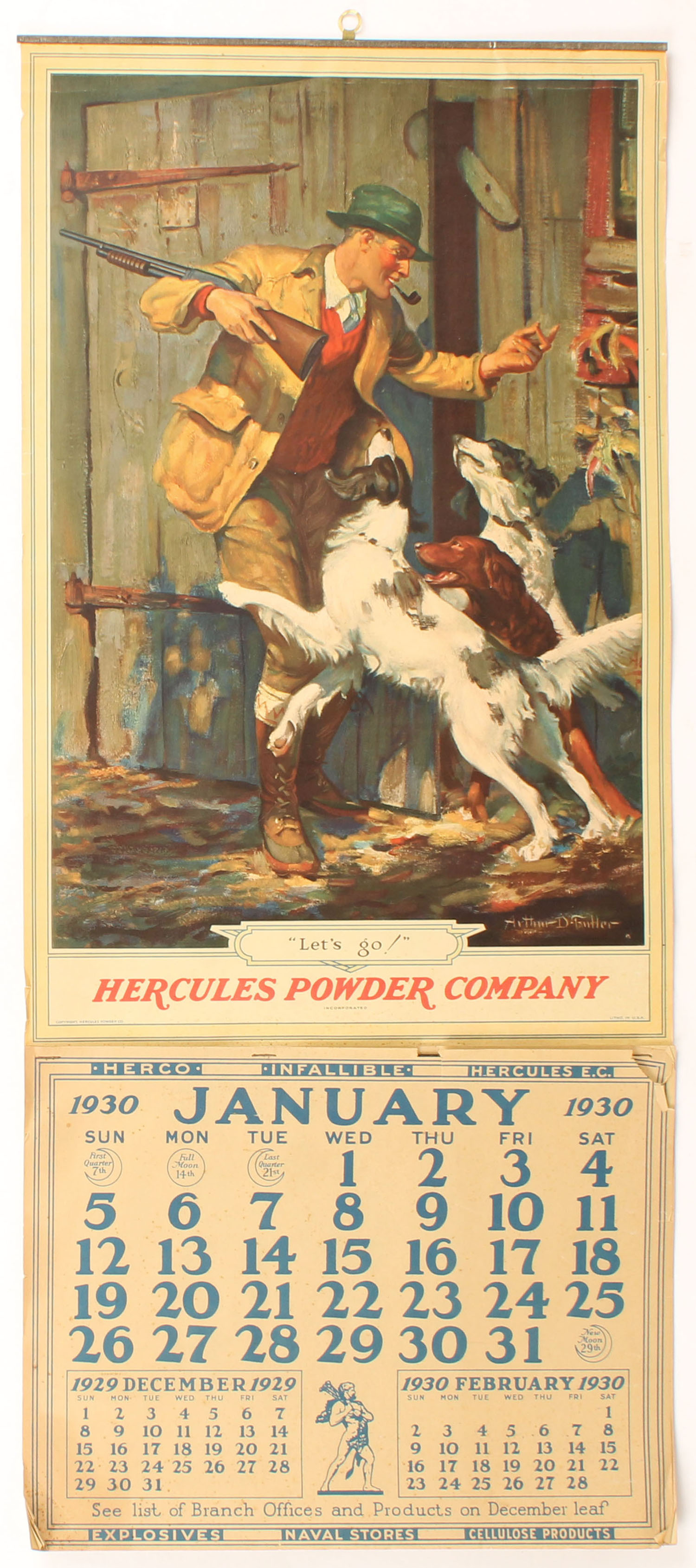 1930 Hercules Calendar, ''LET'S GO!'' by Arthur D Fuller, pictures hunter & his dogs ready to go hunting, has metal band & brass hanger on top, Full Pad of Pages, 13'' x 30'', has great colors with very light edge wear. Grade: Excellent + - Value: 500 to 1000