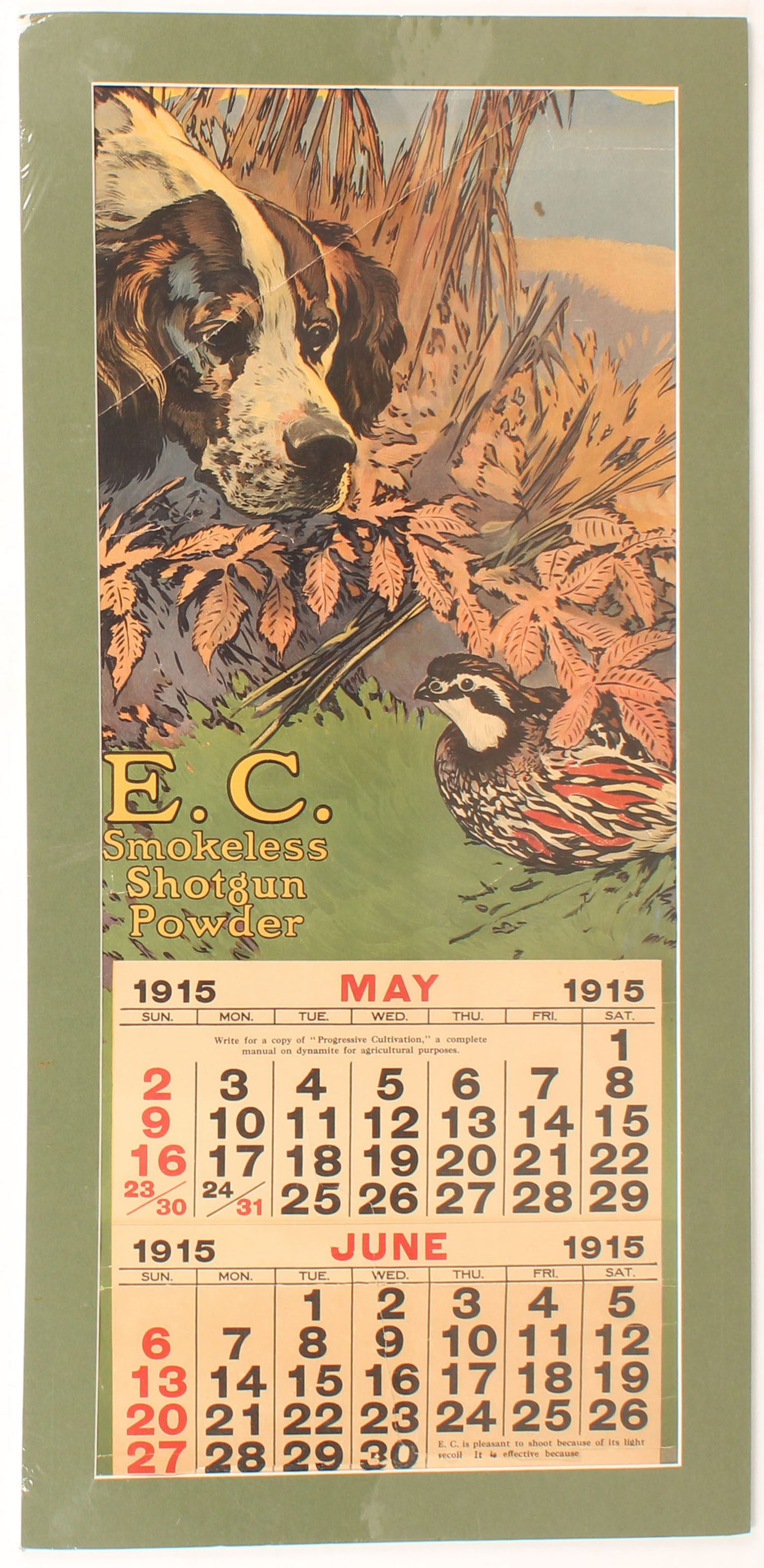 1915 Hercules E.C. Calendar page, May & June, pictures a don on point with quail hidden in grass, 1'' x 26'', matted. Grade: Excellent - Value: 50 to 200