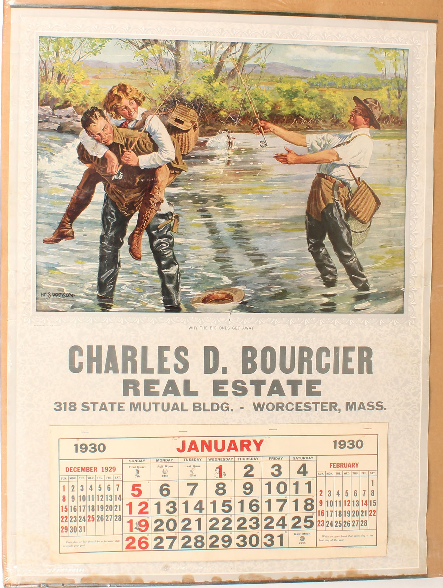1930 Hy S Watson Calendar ''AWHY THE BIG ONE GET AWAY'', pictures guys fishing & trying to help a girl cross a river while landing a trout, 25'' x 24'', bands top & bottom with brass hanger. Grade: Excellent - Value: 30 to 200