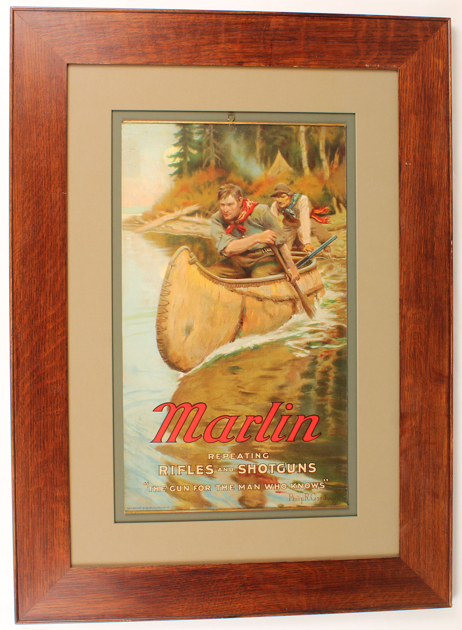 Marlin Firearms Co. Poster, ''REPEATING RIFLES AND SHOTGUNS, THE GUN FOR THE MAN WHO KNOWS'', by Philip R Goodwin, BANDS TOP & BOTTOM, with brass hanger, 14'' x 24 1/8''. Wonderful image of hunters in birch canoe headed across the river from camp. Glued onto a board. Has great color. with no edge wear, framed? HARD TO FIND! Grade: Excellent + - Value: 1000 to 4000