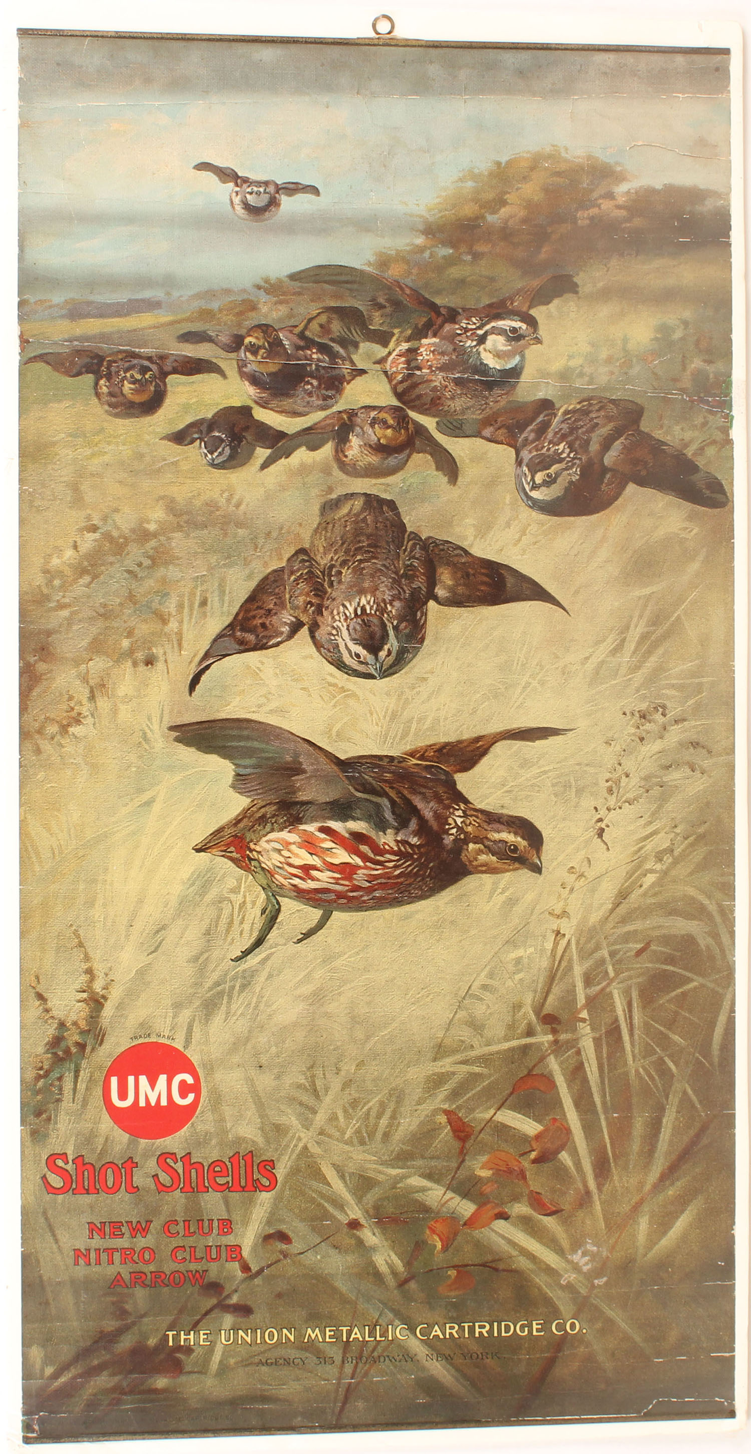 UMC SHOT SHELLS POSTER, ''NEW CLUB, NITRO CLUB, ARROW'', near perfect full color image of Covey of Quail in flight coming right at you, shows roll wrinkles otherwise great colors, has bands top & bottom with brass hanger, 15'' x 29 1/4'', EXTREMELY RARE & NEAR MINT! Grade: Excellent - Value: 1000 to 2000