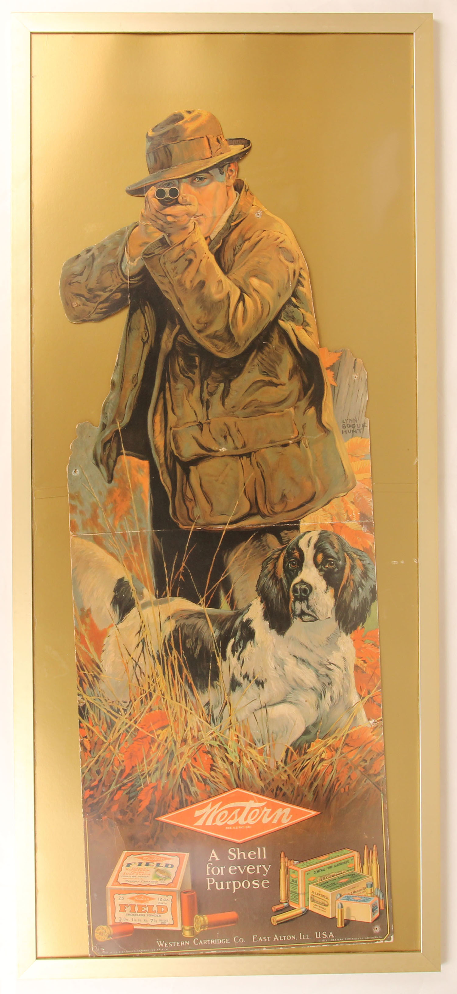 Western Diecut by Lynn Bogue Hunt, pictures hunter shooting right at you with dog on point & many ammo boxes at the bottom, 21 1/2'' x 60'', framed, shows some creased & edge wear, color is nice but some fading over the years. Grade: Very Good ++ - Value: 800 to 2000