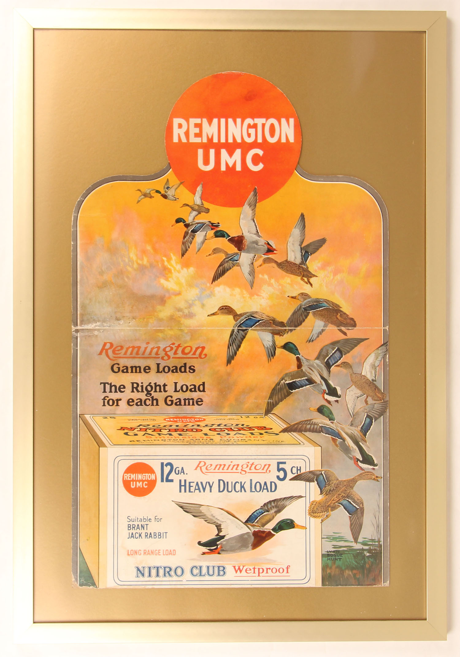 Remington HEAVY DUCK LOAD Diecut by Lynn Bogue Hunt, pictures a large 2pc shotshell box with mallard in fight & many mallards flying at sunset, 22'' x 36'', framed, shows scuffing to middle left & light edge wear, colors are very nice. Grade: Excellent - Value: 1000 to 2000