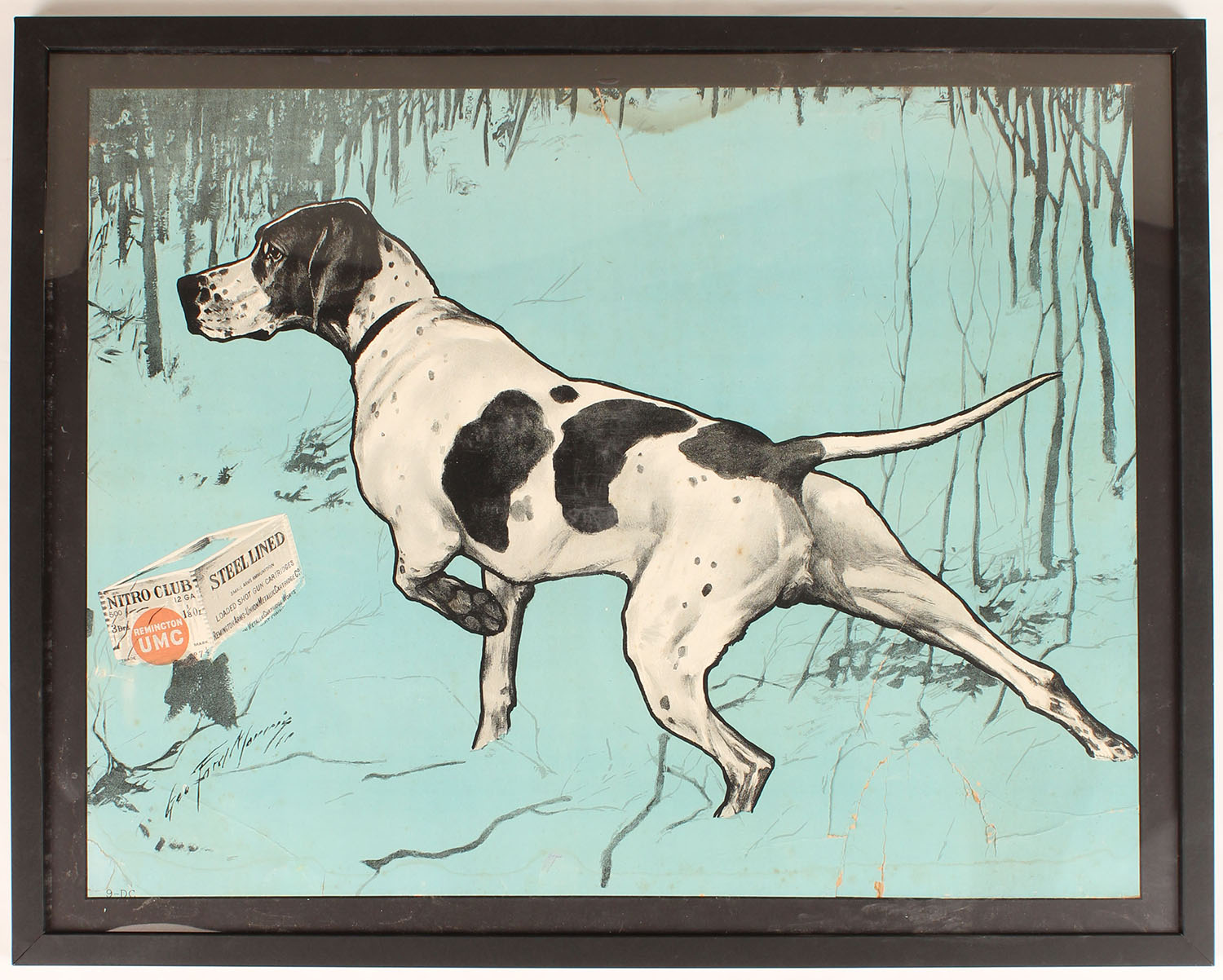Remington UMC Diecut, pictures dog on point with blue background, framed, 26'' x 19 1/2'', shows wood case of shot shells, has tears to bottom right. Grade: Very Good + - Value: 80 to 250