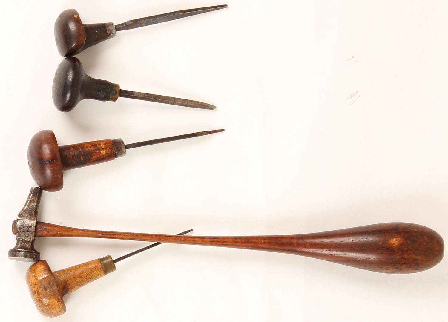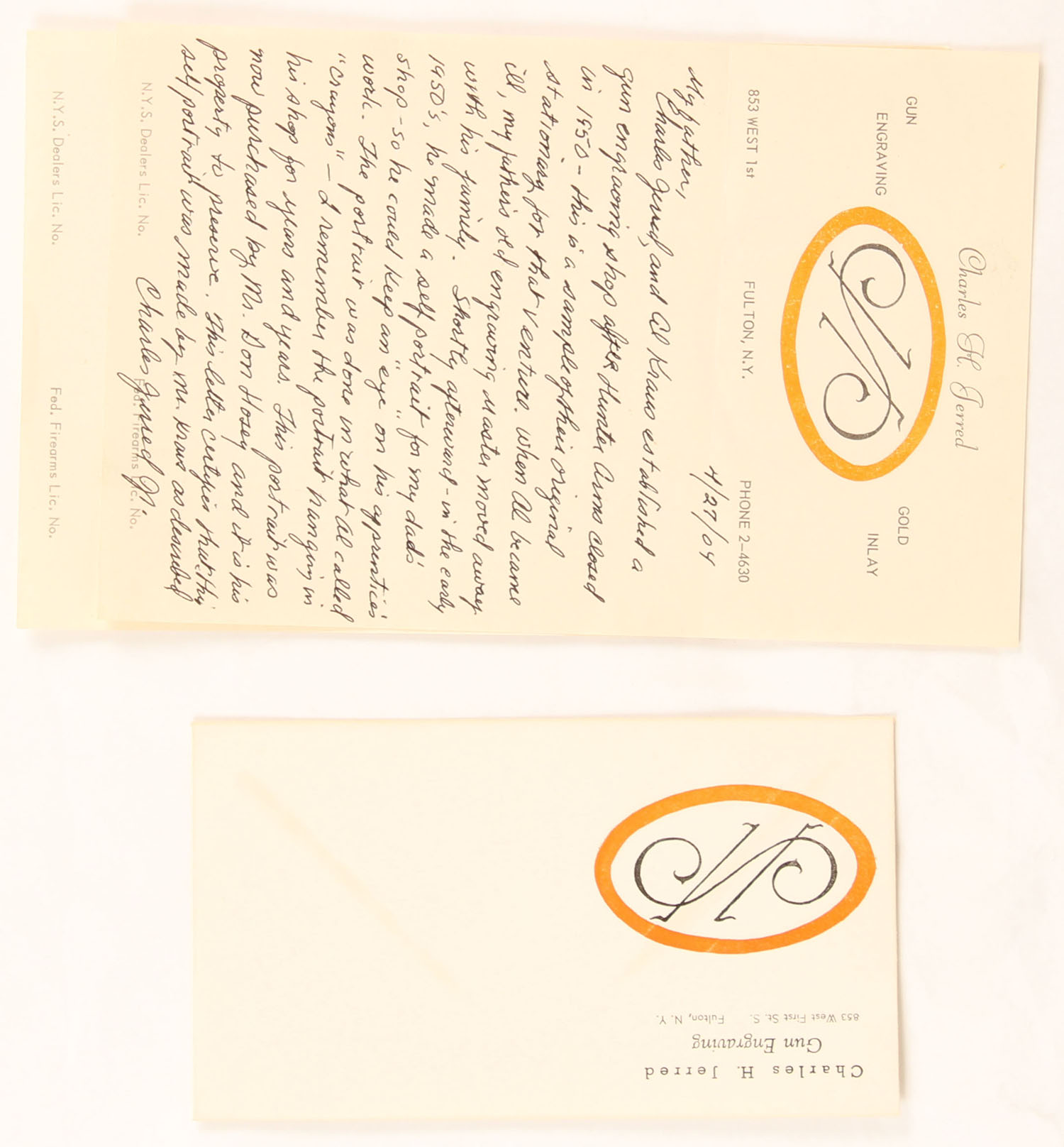 RARE Hunter Arms & L.C. Smith Memorabilia, Here we have items from the personal collection of Mr. Albert Kraus Master engraver at the former Hunter Arms in Fulton, N.Y. from the late 1800's until c 1950, We have a documented letter stating that all of the following items were in the from Mr. Kraus personal items he used to engrave guns & draw, the list includes: his delicate engraving hammer with bulbous counterweight handle and tiny head stamped ''England'', Mr. Kruse used this hammer to engrave L.C. Smith shotguns for many years at Hunter, Item (2) is a small shield shaped watch FOB, appears to be made of silver and was also found in Mr. Kraus' tool chest from hunter, the FOB is delicately engraved with a Woodcock which was engraved by Mr. Kraus for his own use, we has three pencil sketches found in the personal engraving toolbox of Albert Kraus that are proposed engraving layouts for two Smith guns (1) shows detailed scroll and florals, and various geese. Its is about 5'' x 7'', shows pointers in the field and is marked ''Deluxe work'' and ''L.C. Smith''; and (2) about 4 1/2'' x 6'' shows detailed scrollwork and 3 partridges in flight and includes 3 alternative sketches of partridges flying, feeding and being flushed out. Plus engraving tools: other than the hammer, (2) a fine hand graver marked ''Sandoz'', and (3) another hand graver called a double line graver - with double points, (4) B&W photo of Smith Gunworks, (5) three letterheads & envelopes (two of witch have handwriting, (6) a colored self portrait of Mr. Kraus, (7) notarized two page letter authenticating all of this belonged to Mr. Kraus. See lot 8273 for some hand written letters by Mr. Krause, Very Rare opportunity to own a piece of gun making history! Grade: Excellent - Value: 500 to 2000
