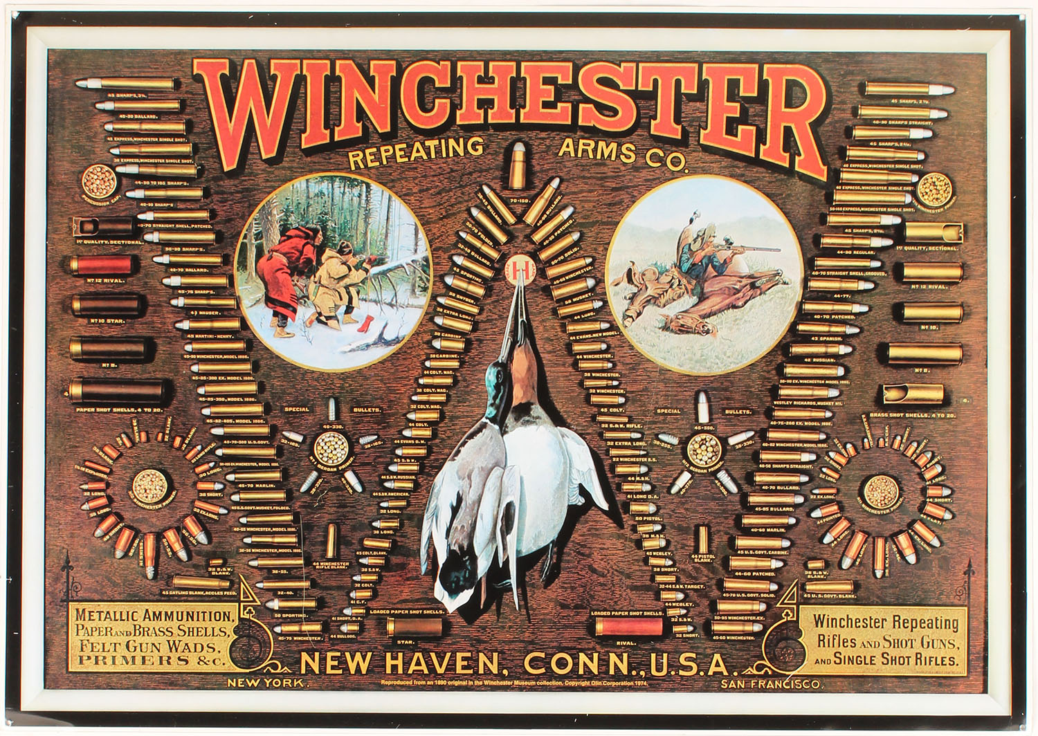 Winchester Single W Cartridge Board Tin Sign, this is the one that has the 70-150 cartridge at the top center, 24'' x 17''. Grade: MINT - Value: 10 to 50