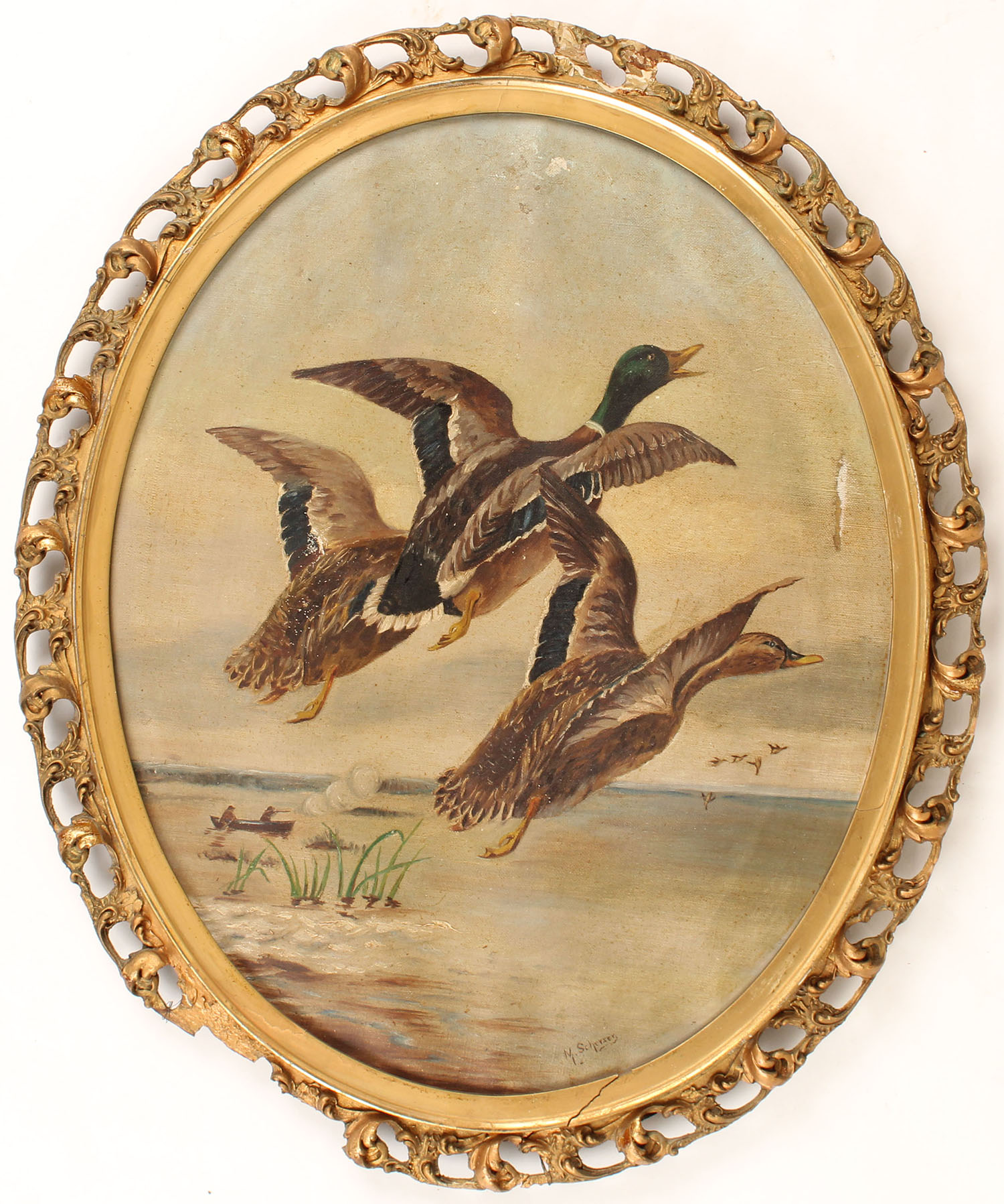Original oil on canvas by M. Scheysey THEY ARE HITTERS, this is the same image used on the Winchester Poster and to this point no one knows the artist, is this the original used to make the famous Winchester poster? The details are spot on to the poster, shows three mallards in flight with hunters shooting at them in background, has intricate gold plaster frame which is broken, image shows two scuff marks & has darken from age, 15 1/2'' x 19 1/2'' images size. Grade: Very Good - Value: 100 to 5000