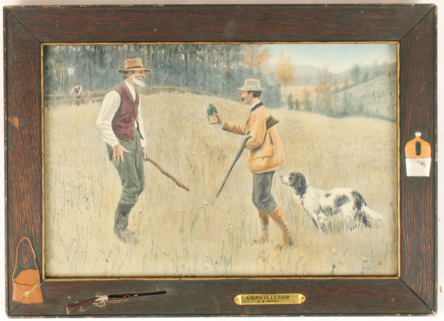 A.B. Frost Litho, pictures full color image of hunter offering the farmer a shot of whisky while bird hunting, ''CONCILIATOR'', frame has raised gun, leather pouch & whisky flask, 17 1/2'' x 12''. Grade: Very Good ++ - Value: 30 to 200