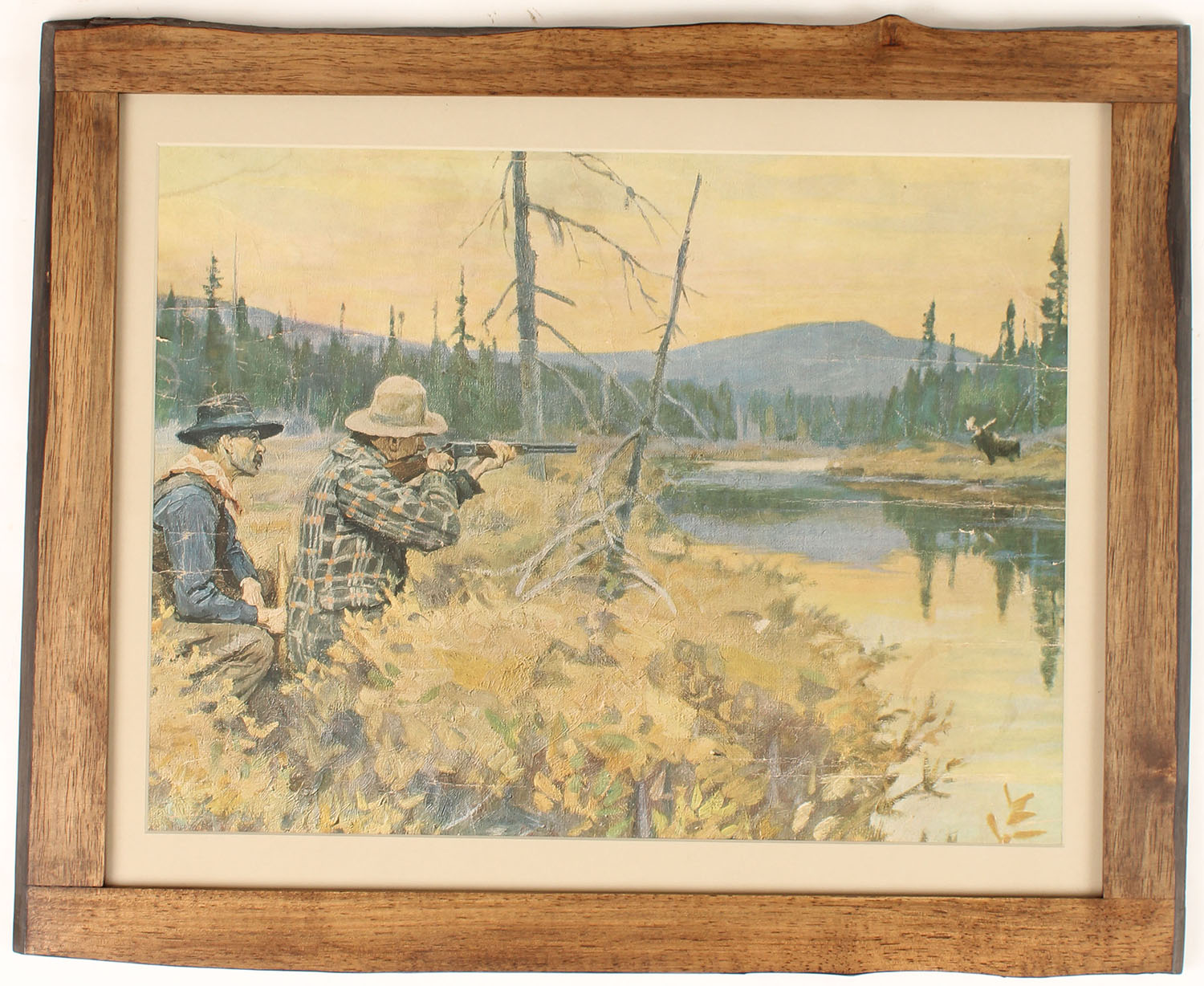 Print of moose hunters shooting at a bull moose across the lake, framed & matted, has a few crease marks, framed, 18'' x 13 1/2''. Grade: Very Good ++ - Value: 10 to 80
