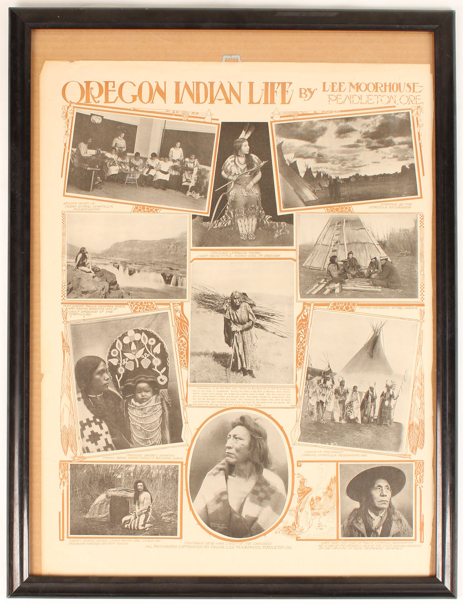 Oregon Indian Life by Lee Moorhouse, Poster, Pendleton, ORE, pictures many real photos of Indians around Oregon, 16 1/2'' x 22''. Grade: Very Good ++ - Value: 10 to 50
