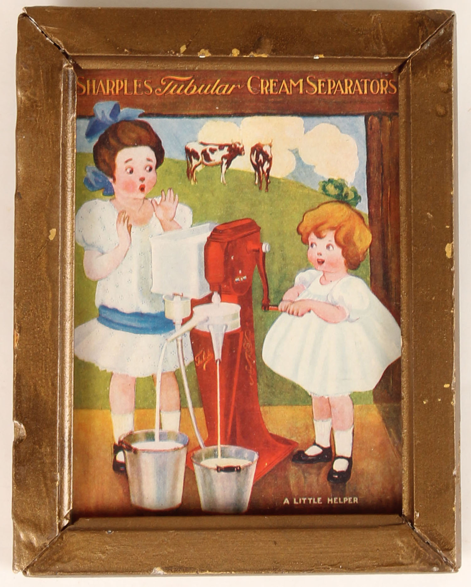 Sharples Tubular Cream Separators advertisement, pictures woman & a child separating cream for the first time, 4 1/2'' x 6'' image size, framed. Grade: Excellent - Value: 10 to 100