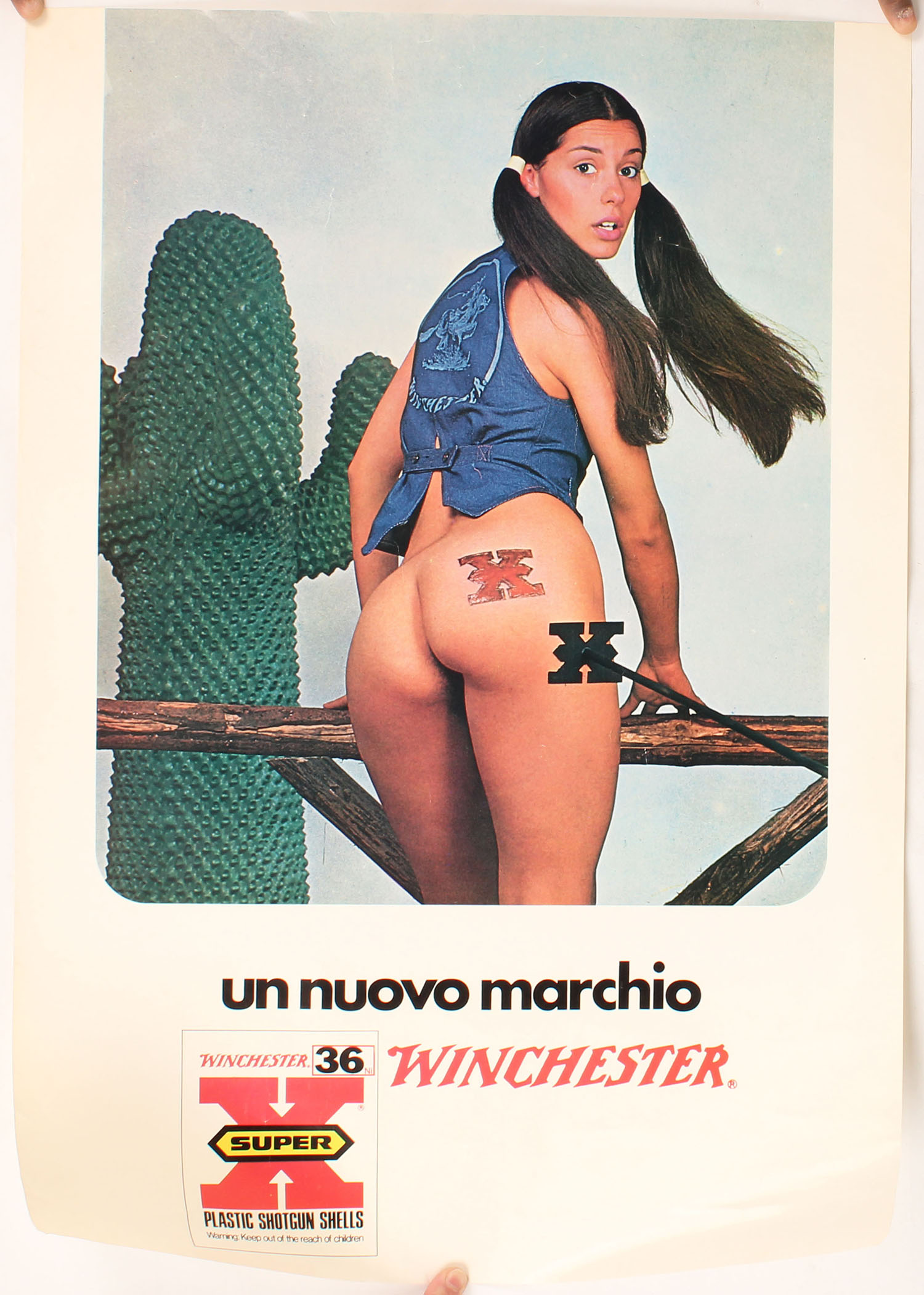 Winchester Poster for Italian market, The Italians printed this poster without the home office approval and got into trouble because of it, therefore, not many exist, it is missing the wording at the top ''MAKE YOUR MARK, WINCHESTER'', pictures young lady with Winchester logo branded on her butt, 19'' x 28''. Grade: Very Good ++ - Value: 100 to 500