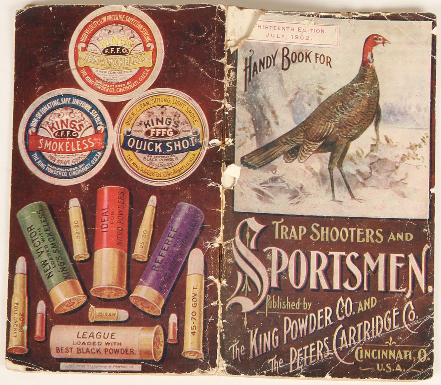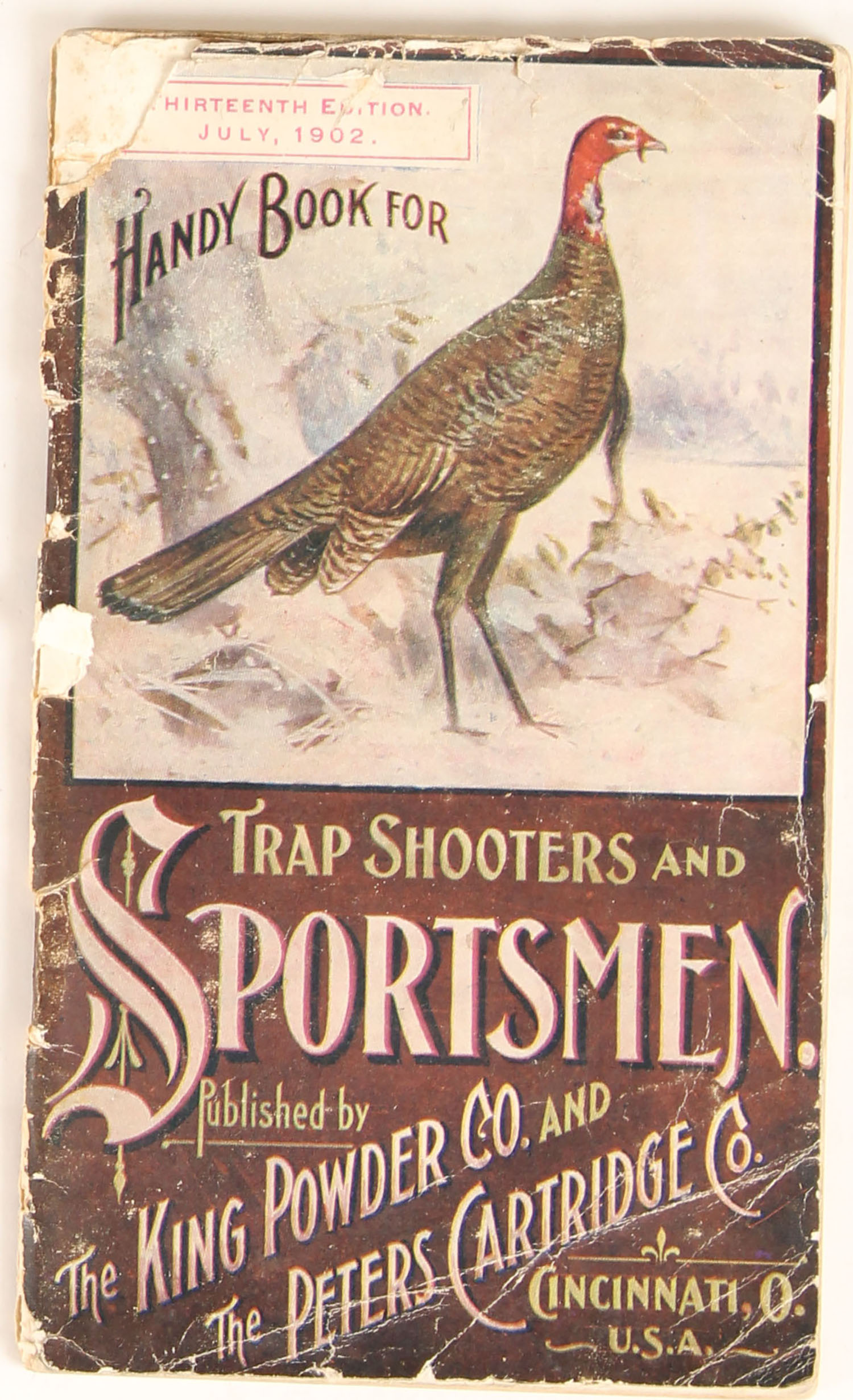 1902 The Peters Cartridge Co. SPORTSMENS Handy book, The King Powder Co., cover has wild turkey in snow scene, back has colorful ammo & powder labels, 66 pages, binding on cover is a little loose, some edge wear. Grade: Very Good - Value: 20 to 200
