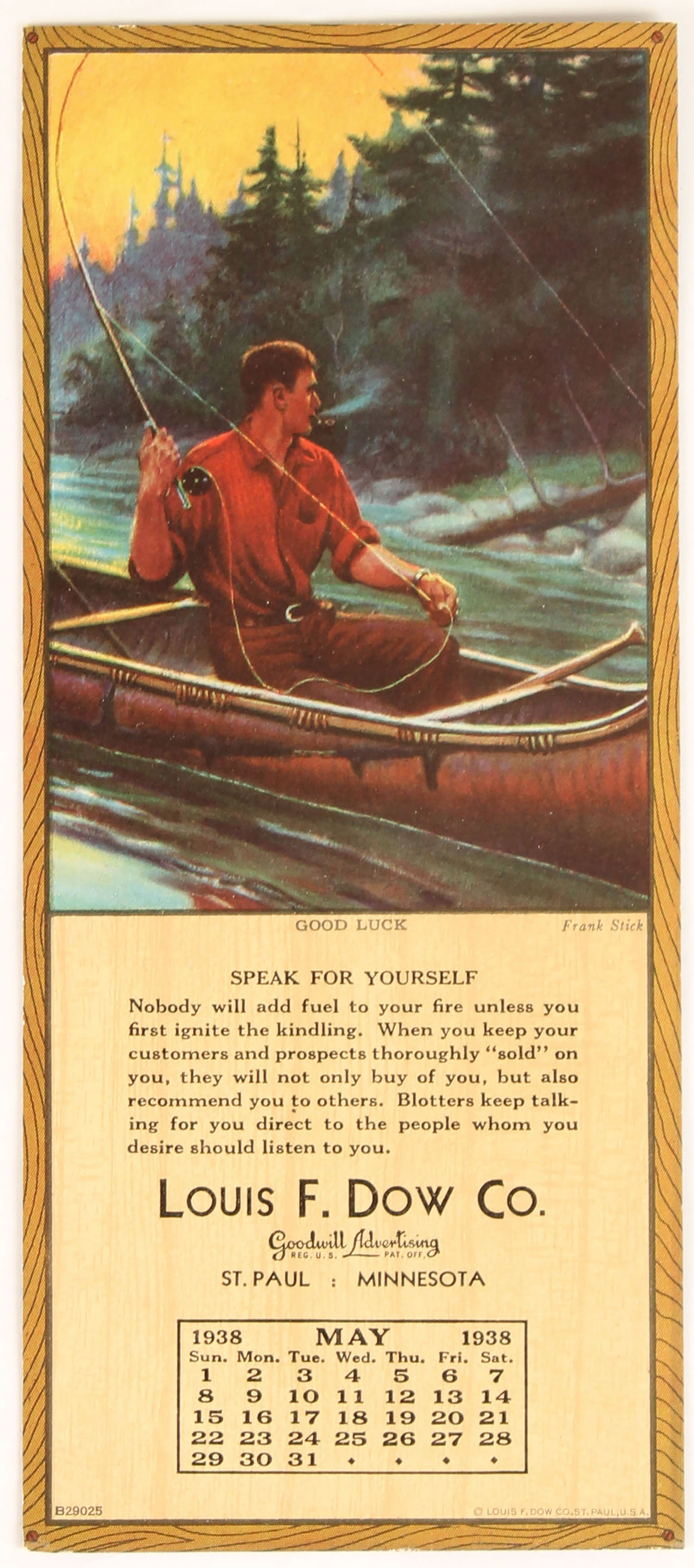 Frank Stick Ink Blotter, ''GOOD LUCK'', pictures a fisherman in a birch canoe fighting a fish, 1938 May calendar page, 4'' x 9'', unused. Grade: Excellent - Value: 10 to 50