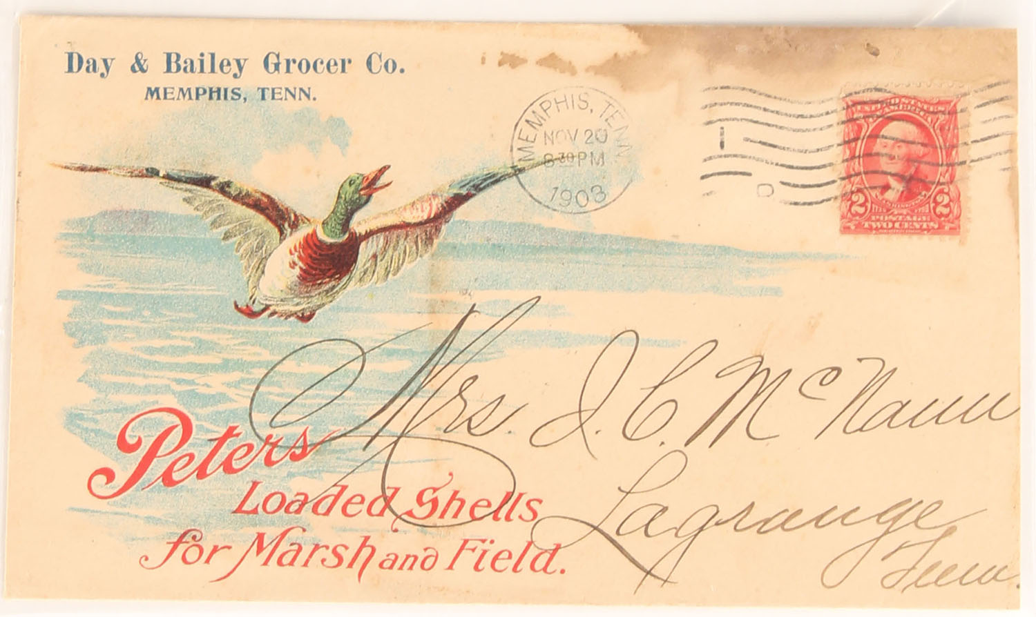 RARE Peters Cart. Co. Envelope, ''LOADED SHELLS FOR MARSH AND FIELD'', 1903 used, pictures full color image of mallard drake in flight, very colorful, shows some stains to top right, back has wonderful full color images of ammo. Grade: Very Good ++ - Value: 100 to 400