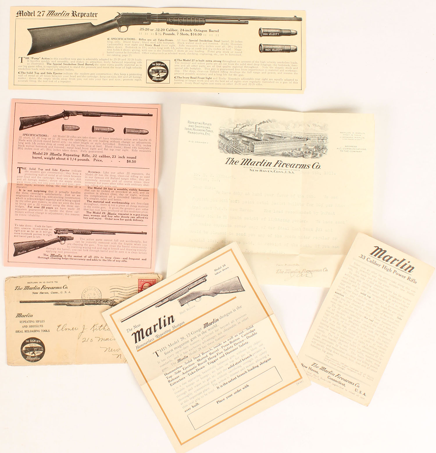 The Marlin Firearms Co. Envelope, dated 1919, pictures the model 24 shotgun, inside has lots of advertisements & one is a fold out with a full color image of the Model 28 shotgun, envelope shows wear. Grade: Very Good - Value: 10 to 60