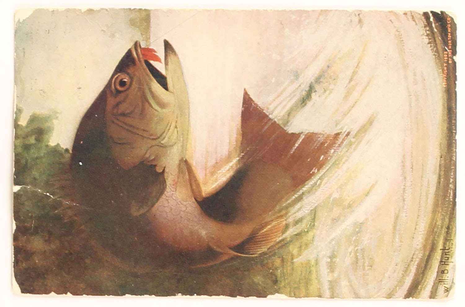 RARE Bristol Steel Fishing Rods Post Card, circa early 1900's, wonderful full color image of fish jumping out of the water with red fly in his mouth. Grade: Very Good ++ - Value: 30 to 200