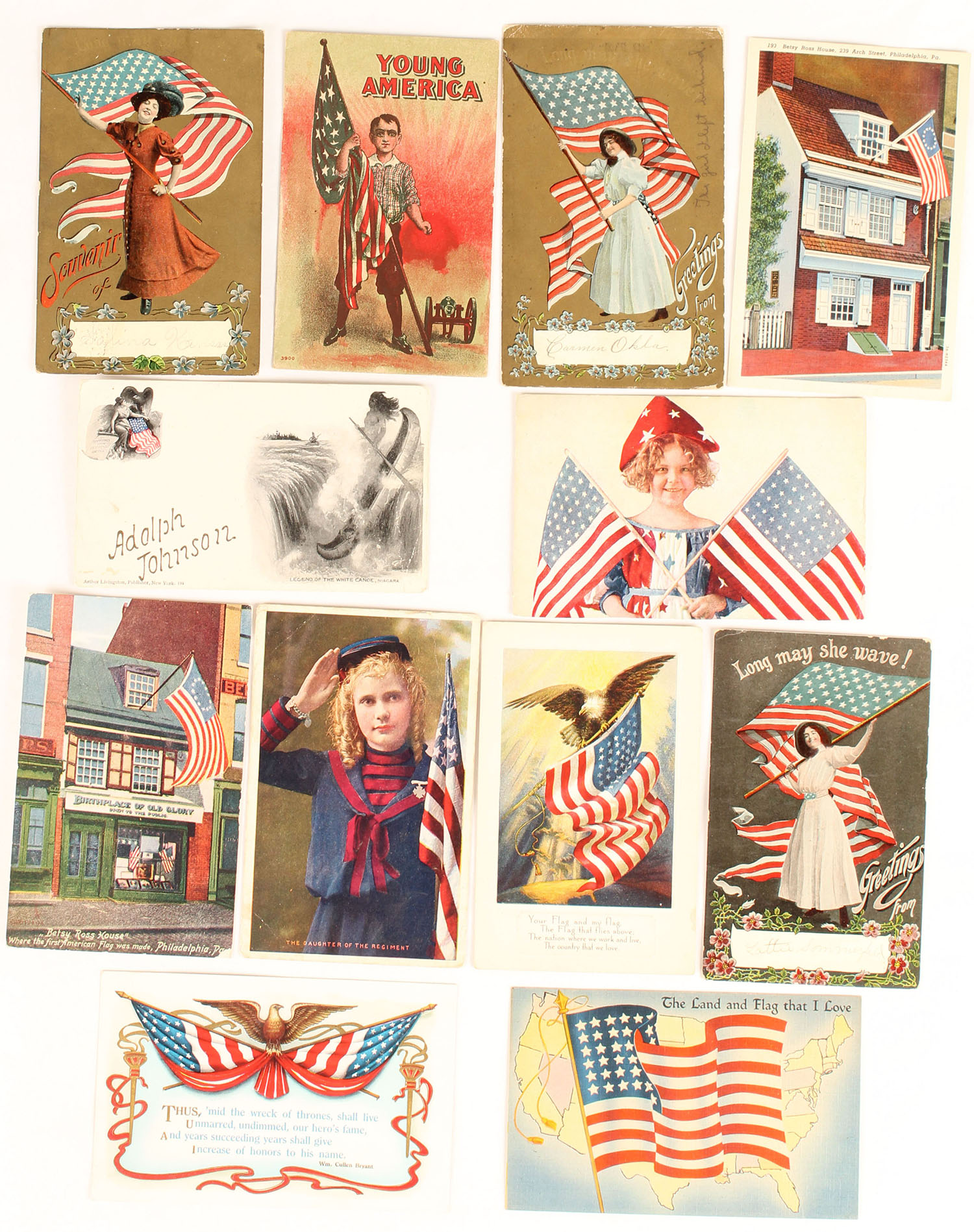 Lot of 12 American flag post card, most are used. Grade: Excellent - Value: 10 to 100