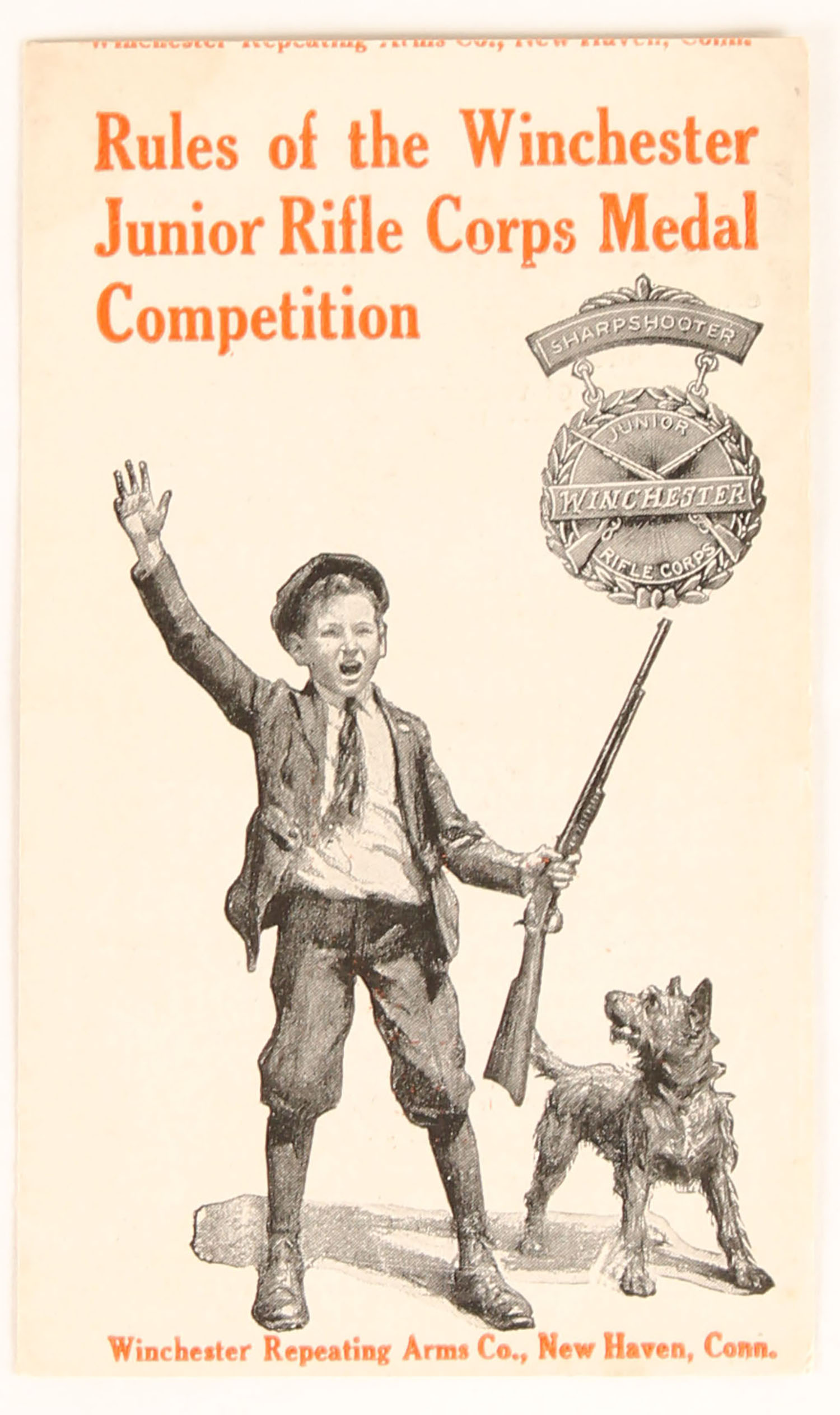 Winchester Junior Rifle Crop tri-fold brochure, ''Rules of the Winchester Junior Rifle Corps Medal Competition'', 3 1/2'' x 6 1/4'', many .22 rifles are pictured. Grade: Excellent - Value: 20 to 200