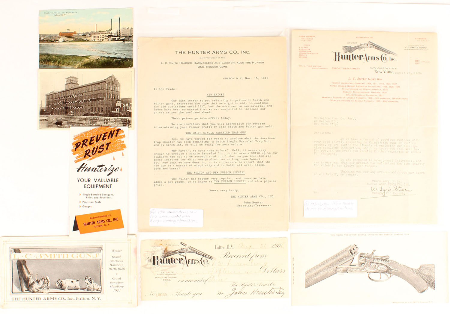 Lot of Hunter Arms (L.C. Smith) paper items & advertisements, two letterheads dated 1916 & 1930, a detailed image of a Breech loading shotgun 1880's, 1906 Receipt form 1906, L.C. Smith catalog, Hunters Arms Brochures, two postcards. Grade: Excellent - Value: 50 to 250
