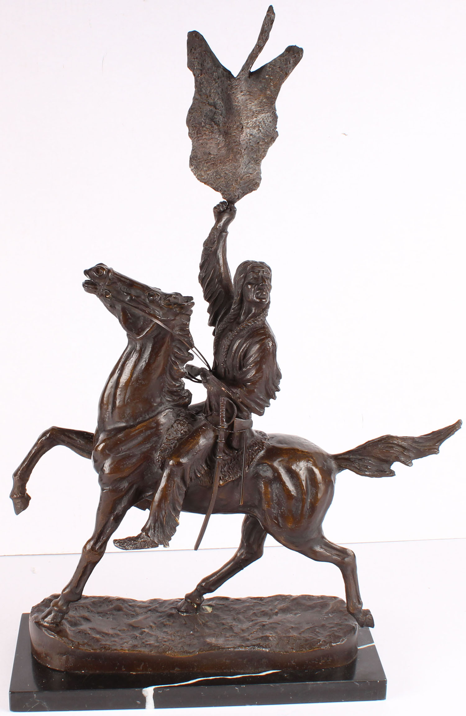 Bronze by Fredrick Remington ''BUFFALO SIGNAL'', has marble base, wonderful detail, 17'' x 29'' x 8'', also signed on base. Grade: Excellent ++ - Value: 400 to 2000