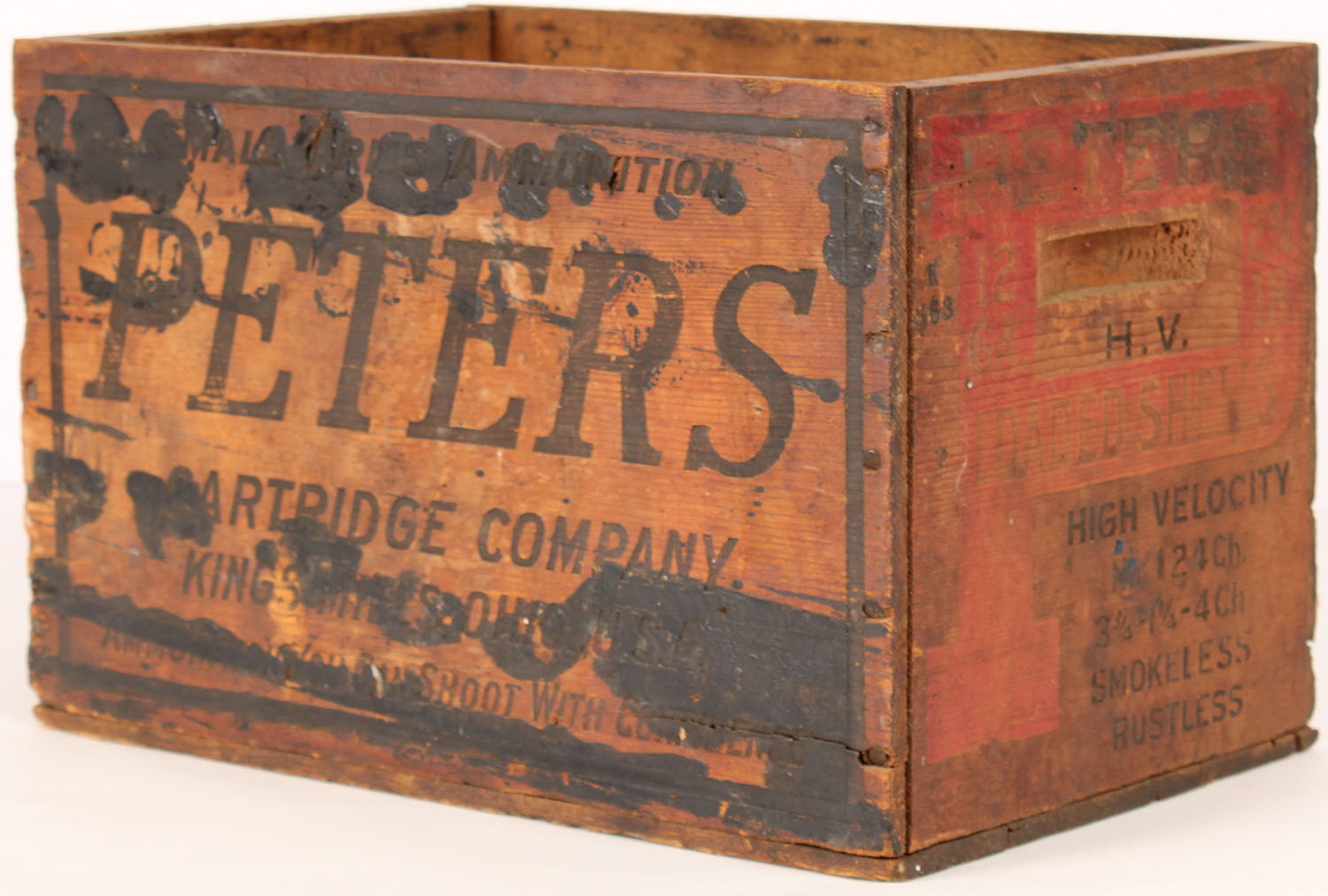 Peters High Velocity wood shipping crate, 12 ga., 4 ch., nail construction, red & black is faded and crate has age soiling. Grade: Very Good - Value: 6 to 40