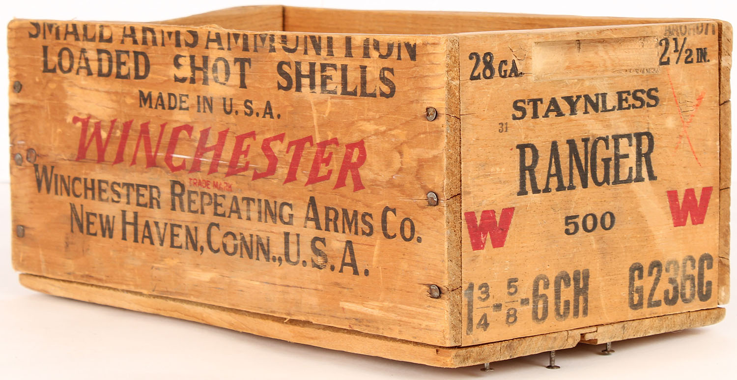 Winchester Range, 28 GA!! 1 3/4 - 5/8 - 6 ch., nail construction wood shipping crate, black & Red print is solid, crate has the top trimmed off slightly & is overall solid. Grade: Excellent - Value: 30 to 100