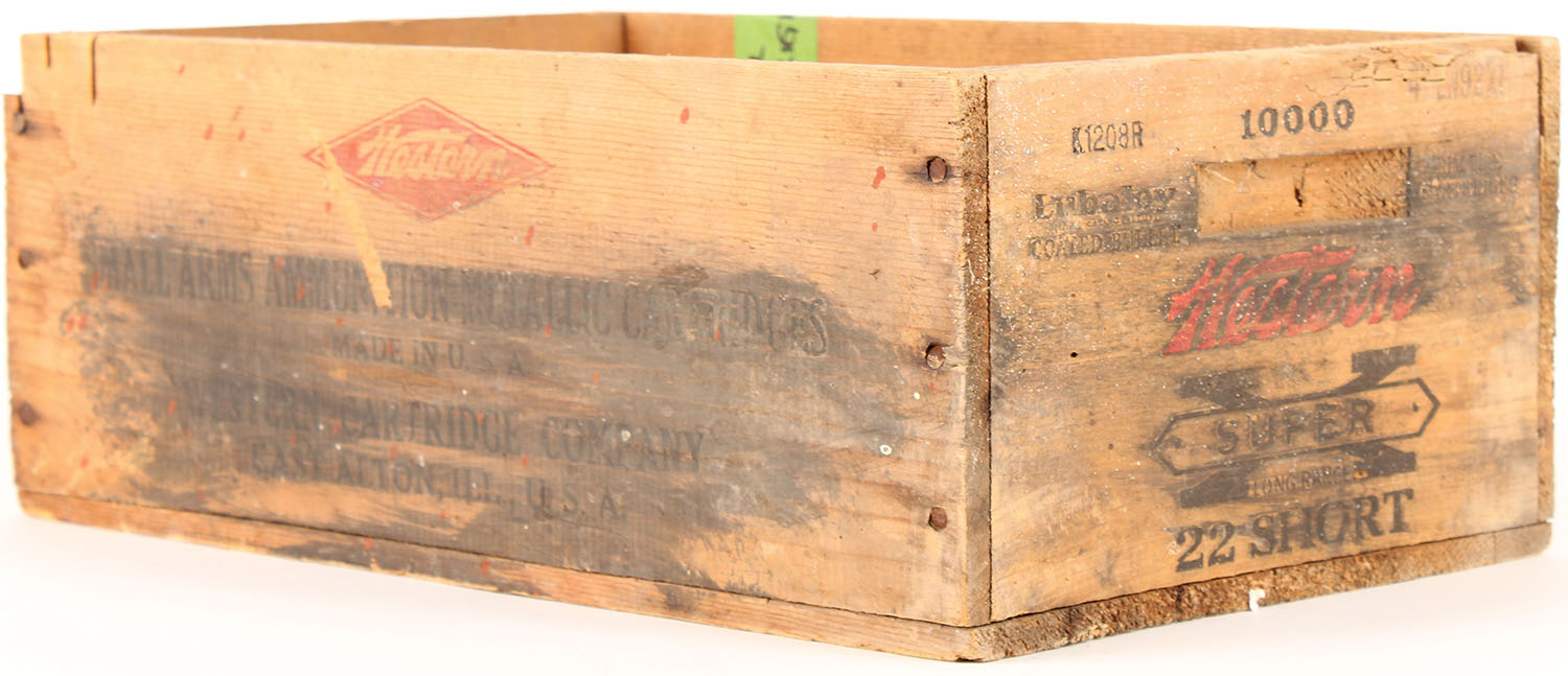 Western Super-X, .22 Short, nail construction wood shipping crate, black & red print is solid, crate has age soiling. Grade: Very Good + - Value: 10 to 40