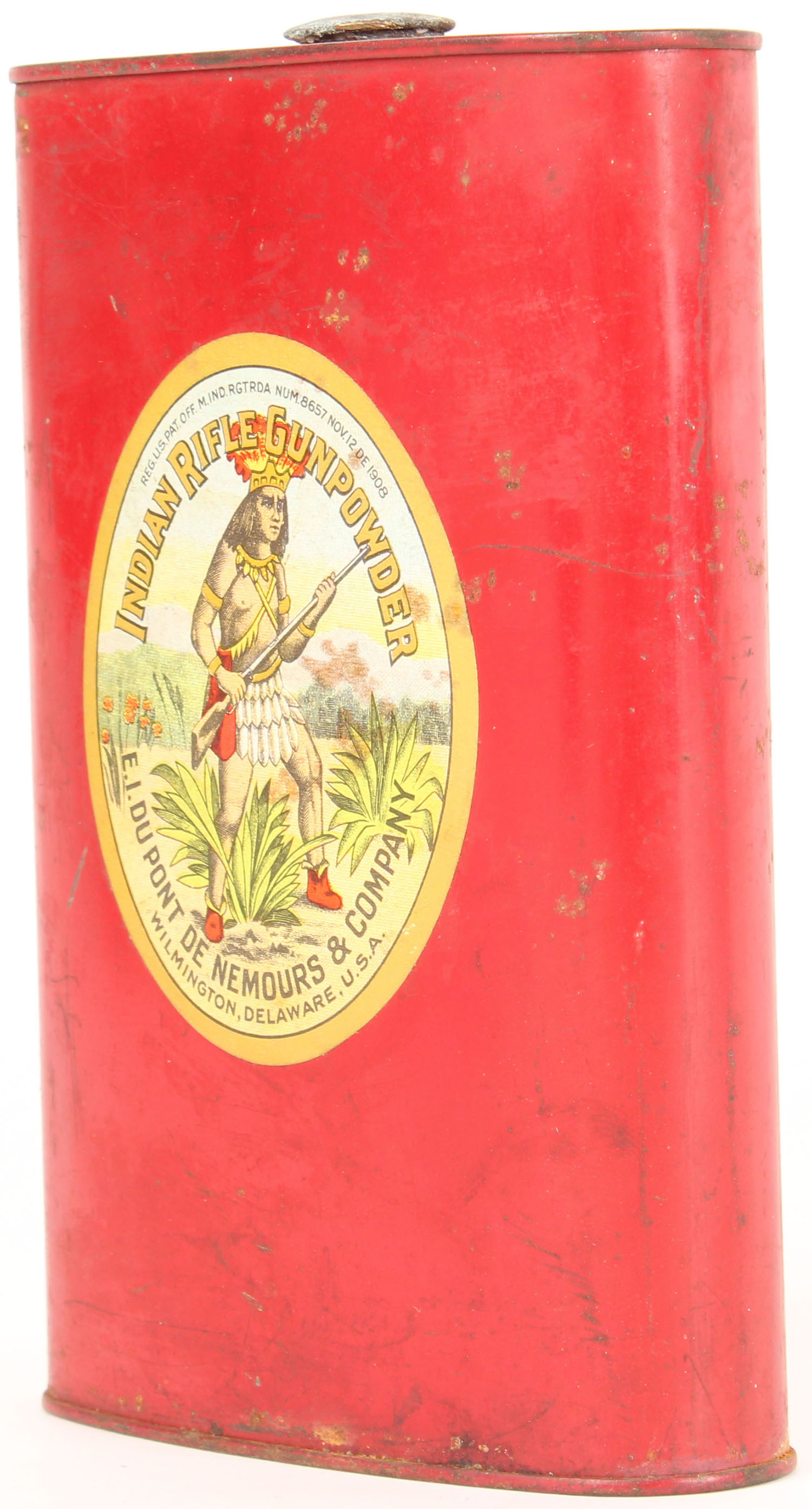 Large Vintage Indian Rifle Gunpowder powder tin, Empty, tin has age soiling but label is very bright and clean. Grade: Excellent - Value: 50 to 250