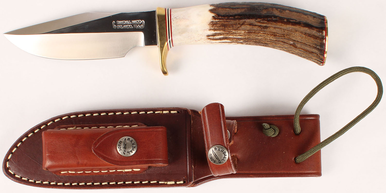 RARE! Randall knife, Model 8-Trout and Bird knife, 4 1/2'' blade, has orginal leather sheath, half hilt, stag handle, very solid and clean! Grade: Excellent - Value: 400 to 800