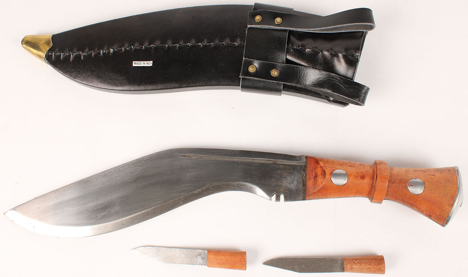 Modern made Khukri with scabbard, made in India, in orginal box, 10'' blade. Grade: Excellent - Value: 30 to 90