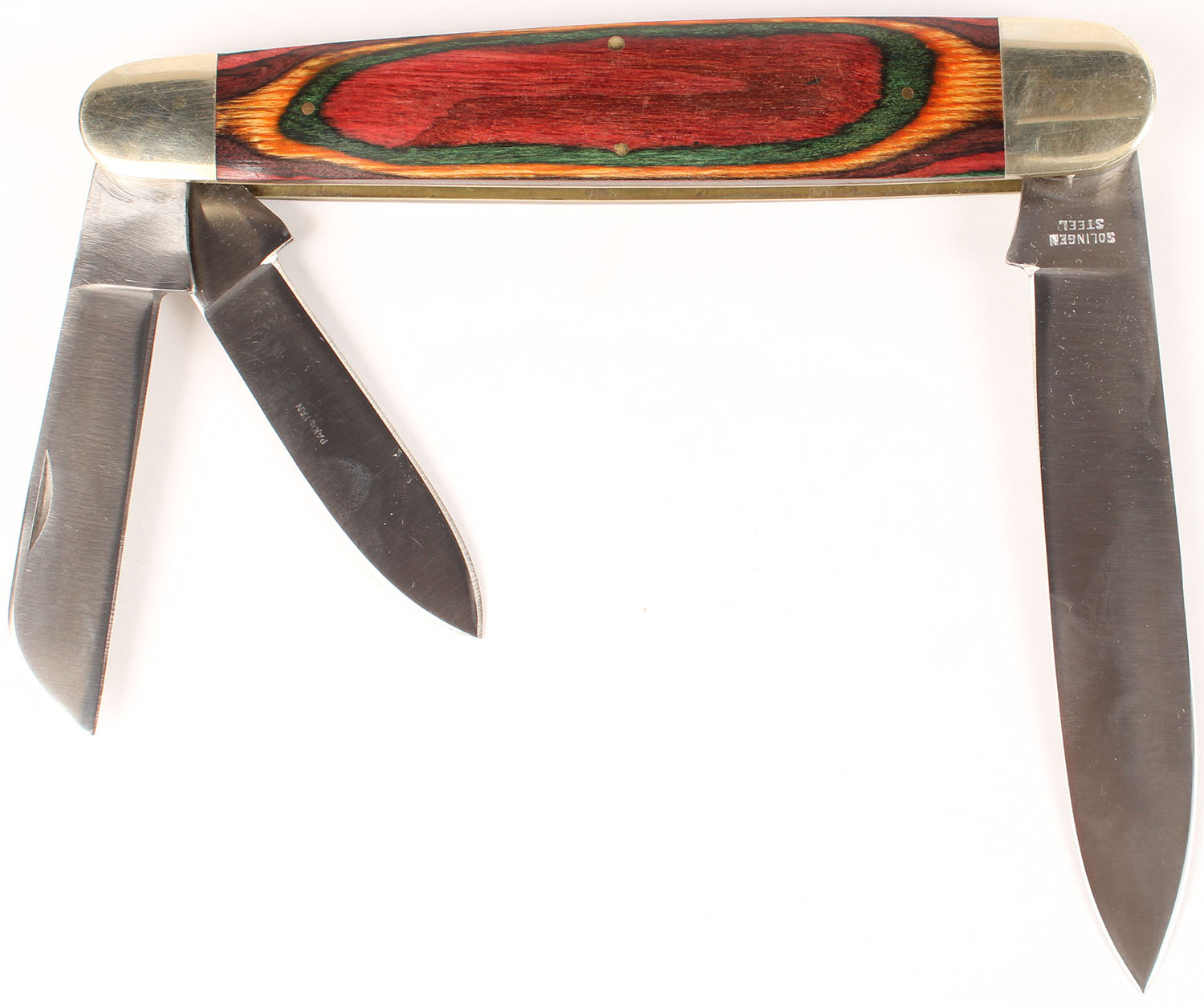 Very Large Frost Cutlery 3 bladed folding knife, 6'' longest blade, multi colored wood grip, all bright and clean. Grade: Excellent - Value: 30 to 150