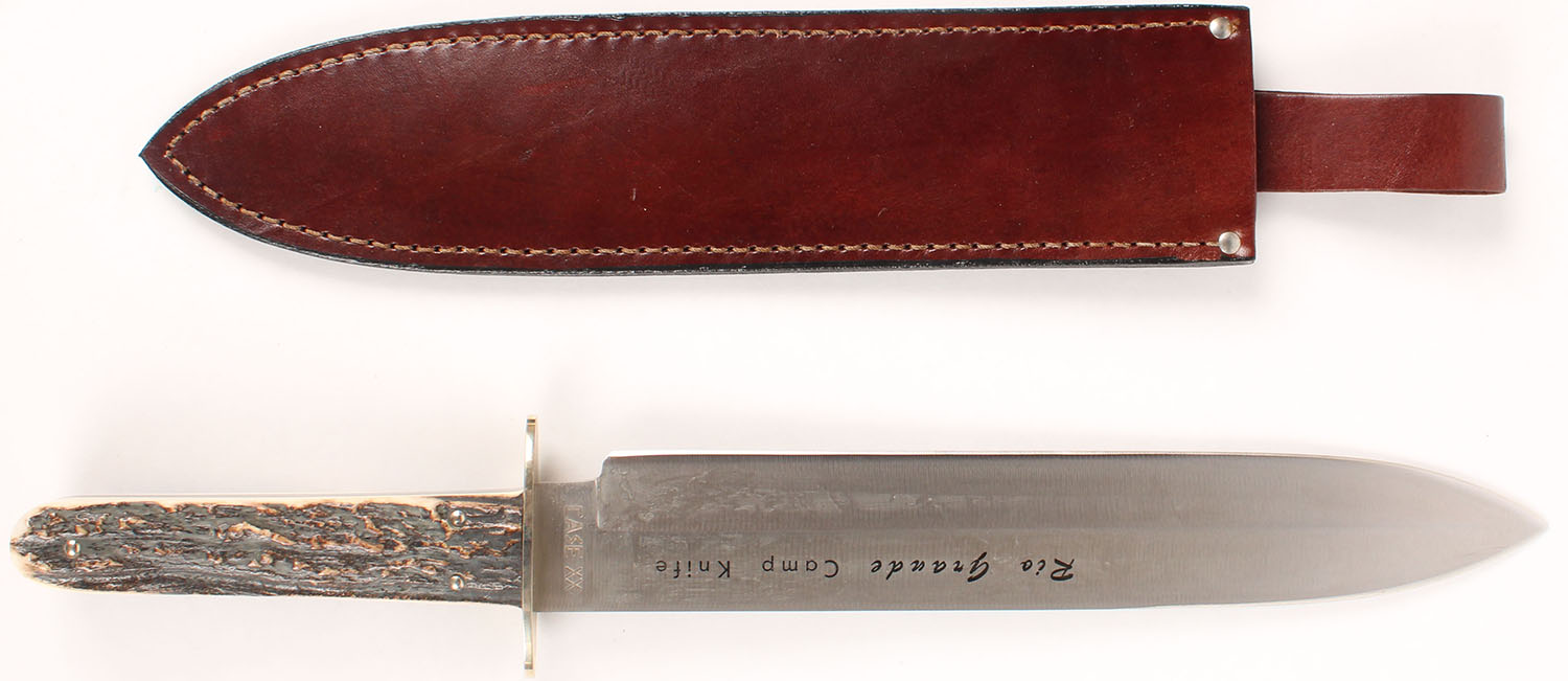 Very Large Case XX Bowie knife, with leather sheath, ''Rio Grande Camp Knife'', stag handle, all bright and clean, 9 1/2'' blade. Grade: Excellent ++ - Value: 100 to 400