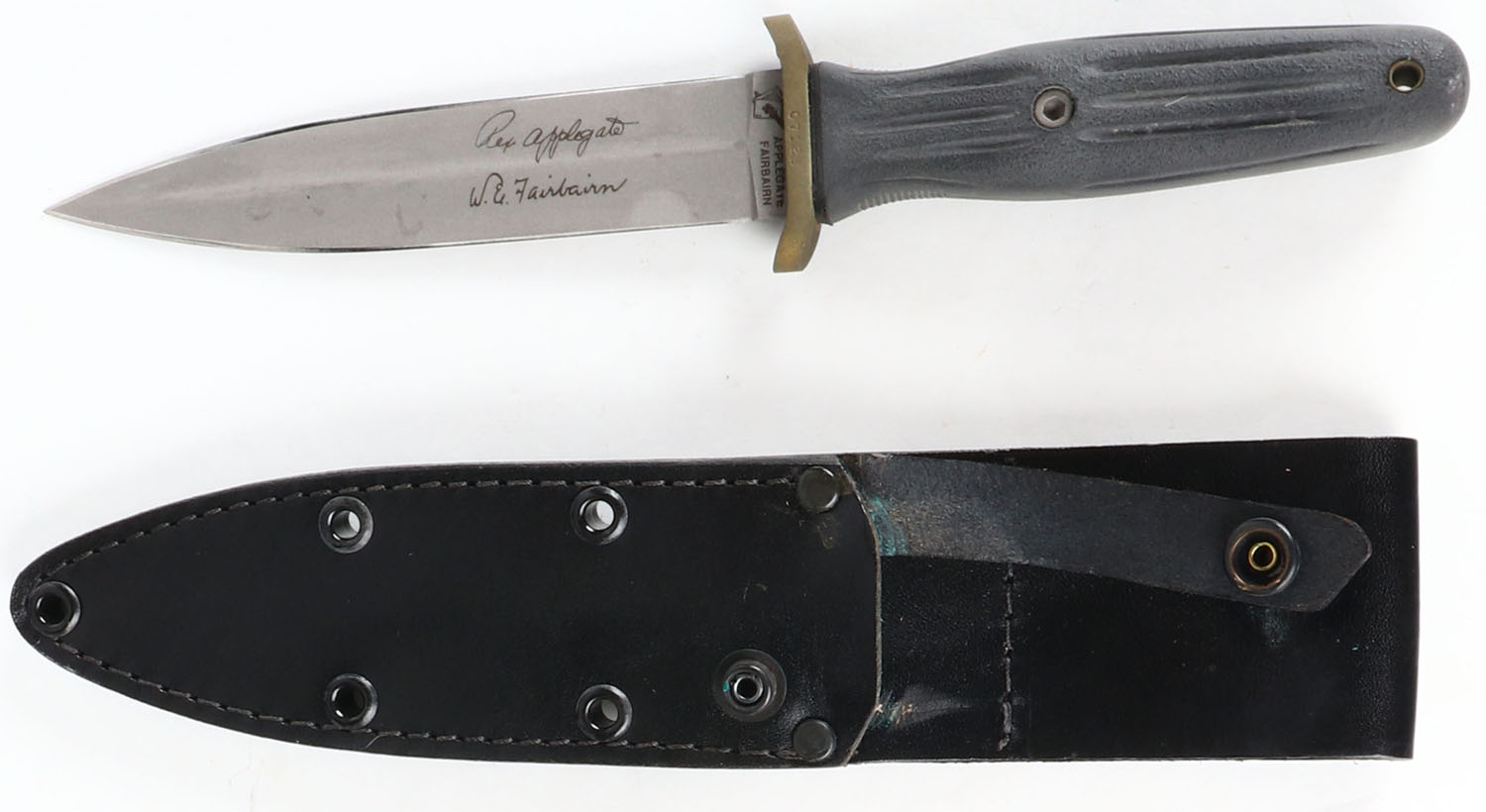 Blackjack knife, Model #7119, fixed blade knife, full hilt, hard plastic handle, 5 3/4'' blade, has leather sheath and orginal box, light build up from leather sheath on hilt but can be cleaned up. Grade: Excellent - Value: 50 to 150