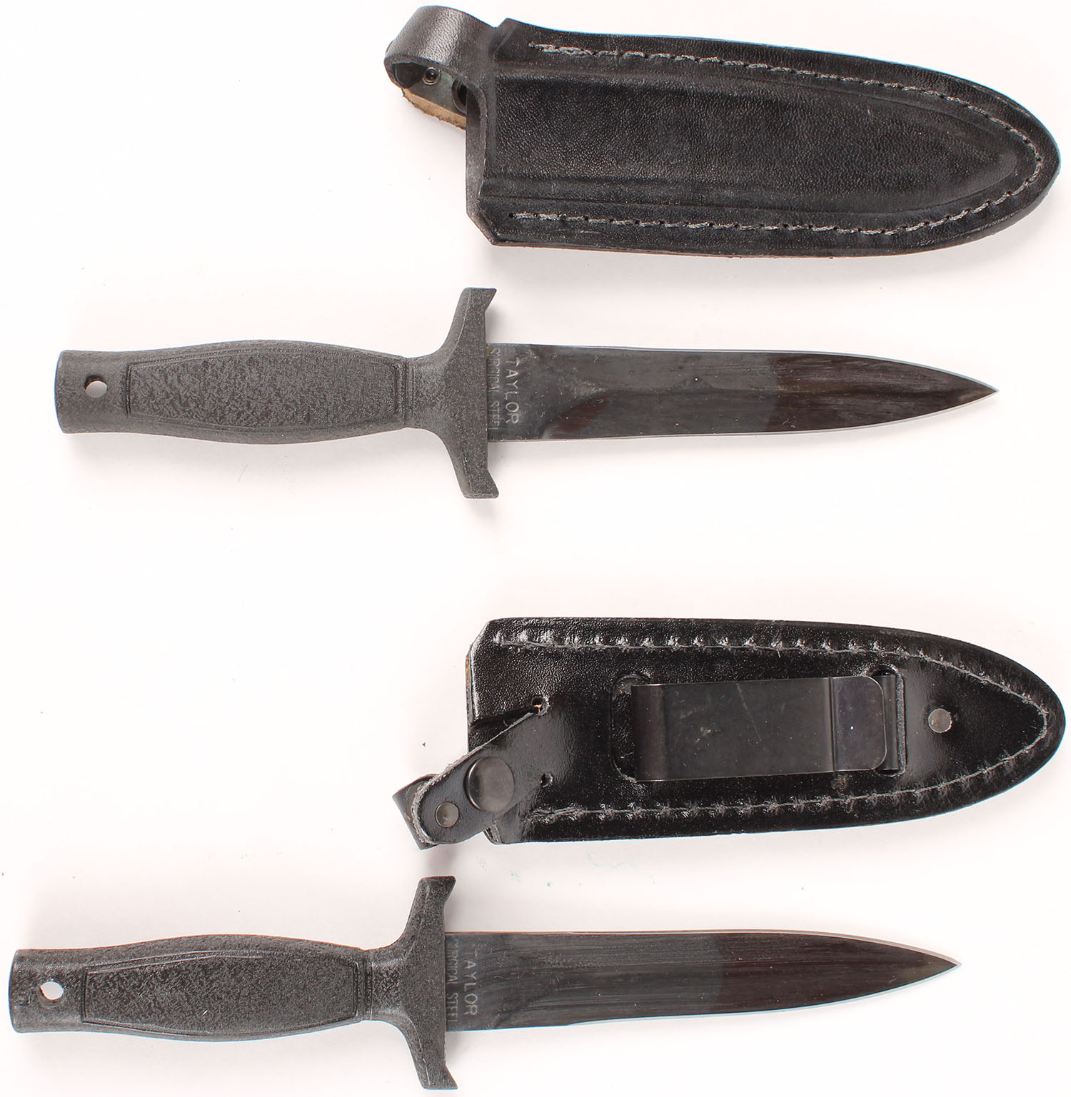 Lot of 2 Taylor fixed blade knives, 4 1/2'' blades, have unmarked leather sheathes, all bright and clean! Grade: Excellent ++ - Value: 50 to 250