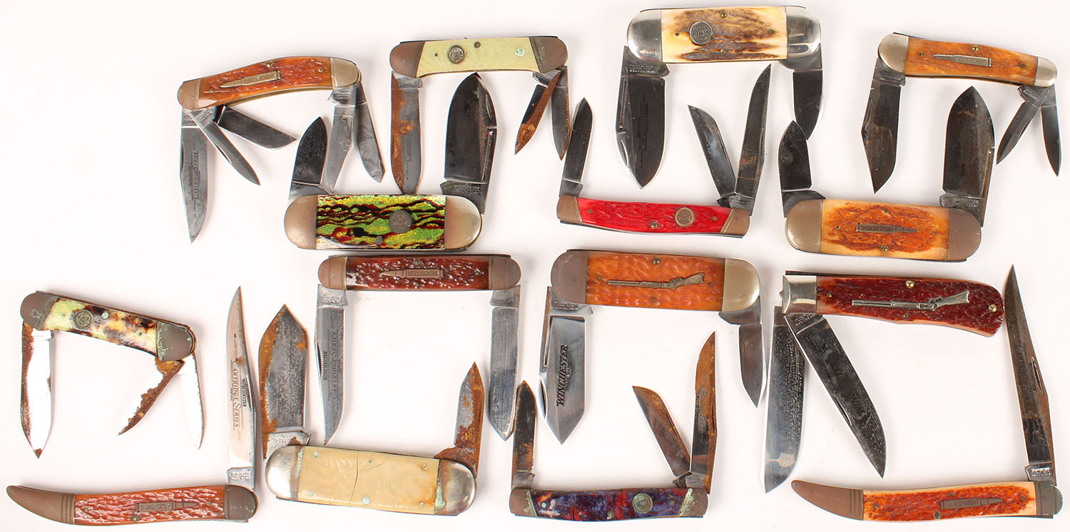 Very large lot of Winchester knives in orginal boxes , all different kinds, all have varying degrees of rust. Grade: Good - Value: 20 to 400