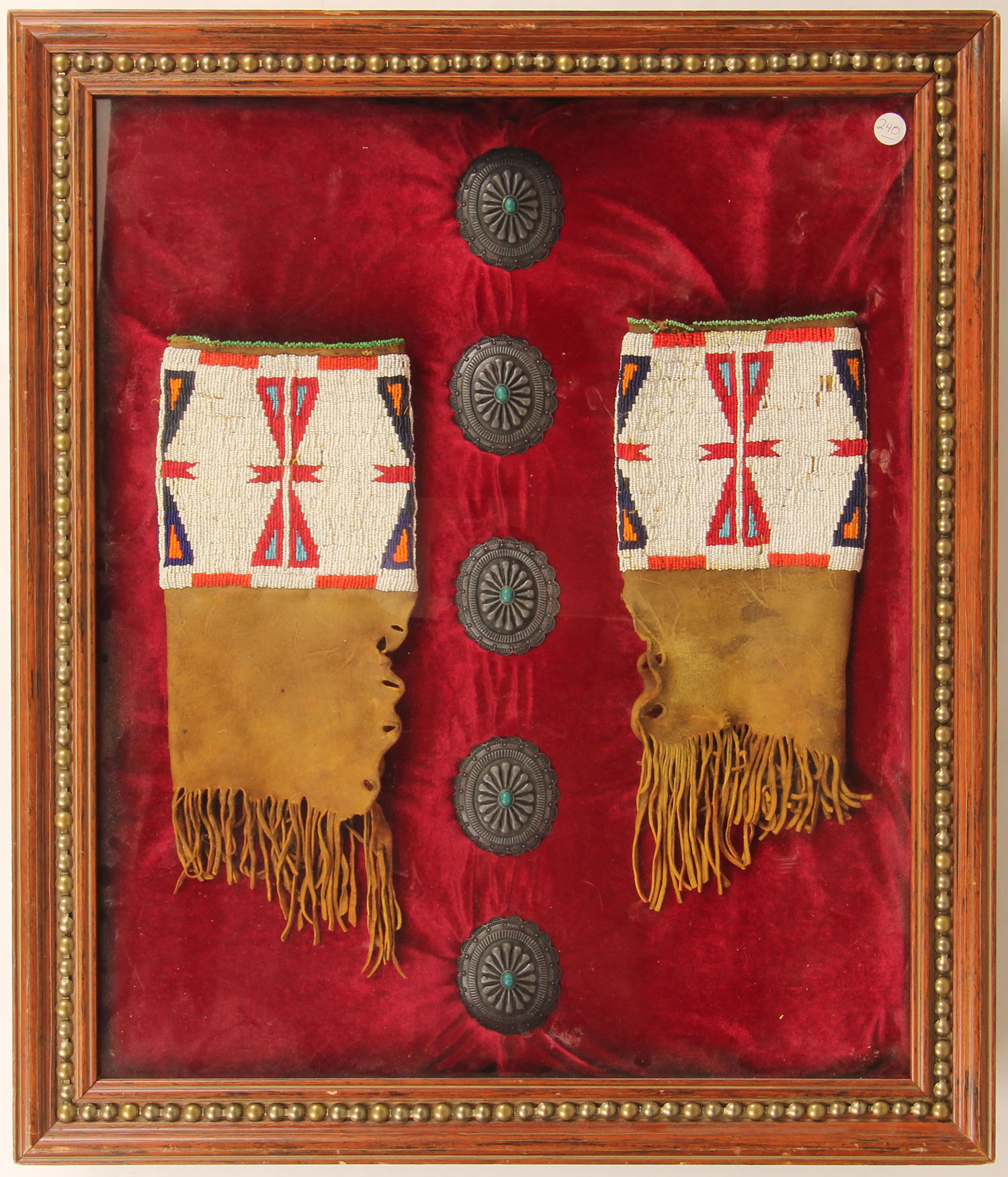 Native American antique hide with colored beads, and 5 badges, some age soiling. Frame: 24'' x 28'' Grade: Excellent - Value: 50 to 400