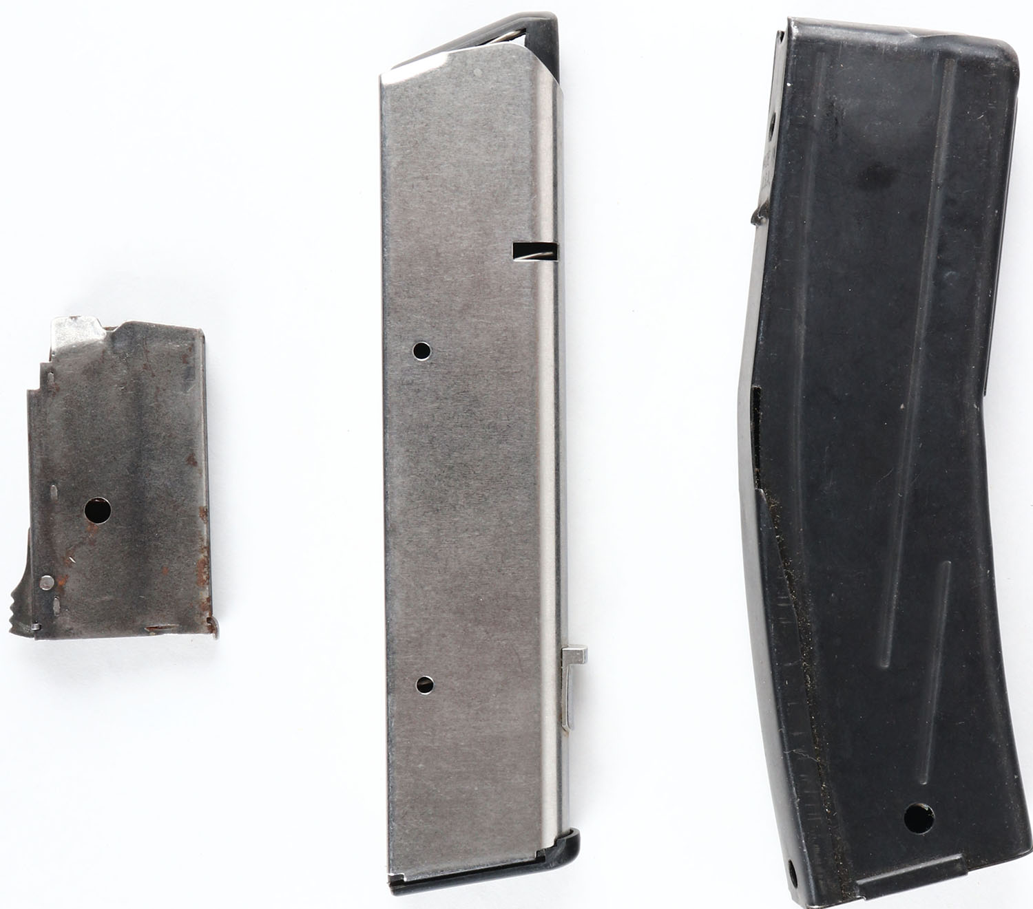Lot of 3 mags, 1 unmarked small amg maybe for 22 LR, large Wilson combat mag maybe for .45 cal and an unmarked M-1 carb mag. Grade: Excellent - Value: 10 to 50