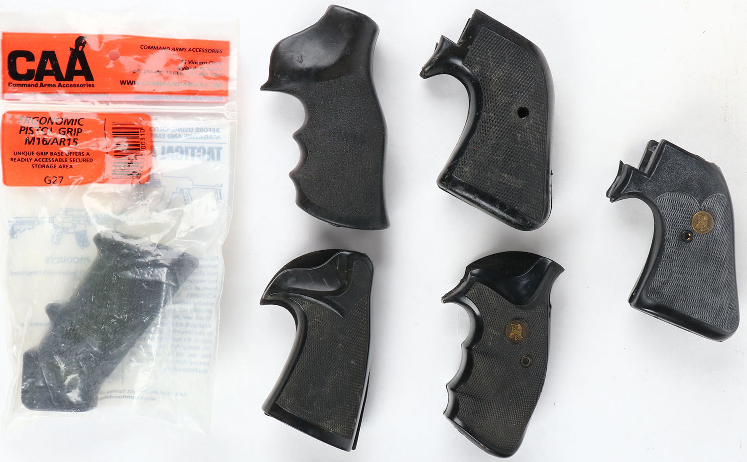 Lot of 6 grips, various manfs, 1 Pachmayr for S&W round butt, 1 Hogue, 1 Uncle mikes for Ruger Super BlackHawk, CAA pistol grip for M16/AR15 and 2 Pachmayr with no other markings. Grade: Excellent - Value: 16 to 60
