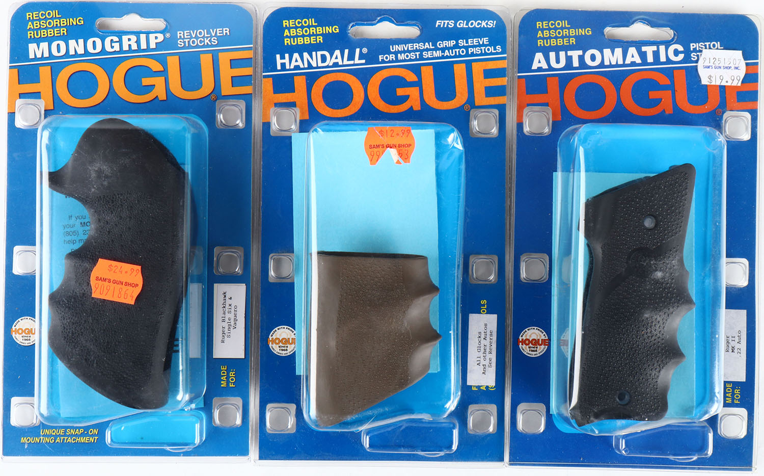 Lot of 3 Hogue rubber pistol grips, Ruger MKII .22 Auto, Ruger Blackhawk Single six & Vaquero and 1 for All Glocks and other autos. Grade: Excellent ++ - Value: 10 to 50