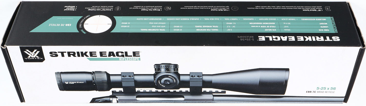 Vortex, Strike Eagle 5-25 x 56, Variable Magnification Rifle Scope, NIB, 34mm Tube Diameter, First Focal Plane EBR-7C (MRAD) Illuminated Reticle, . Grade: MINT - Value: 500 to 1000