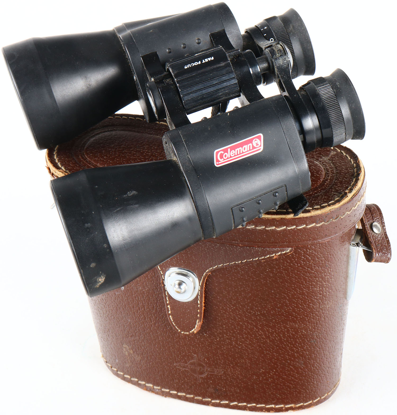 Coleman binoculars, 10x50, foggy view, shows use, has leather case. Grade: Excellent - Value: 10 to 50