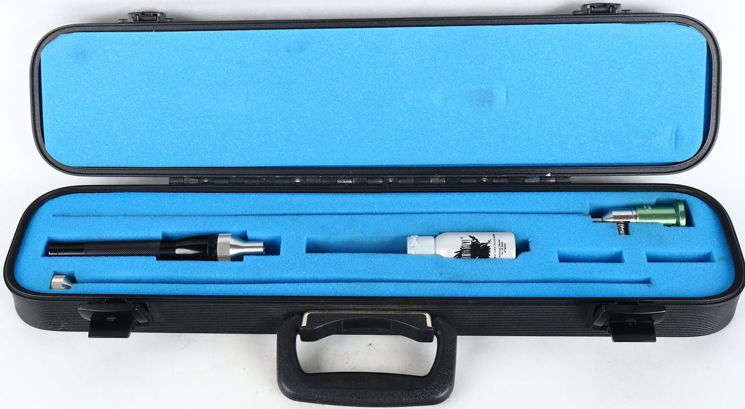 Hawkeye Shooting Edition Slim Rigid Borescope Kit, Precision Borescopes, has borescope, mirro tube, flashlight, cleaning kit, in orginal carrying case, designed to give you an ultra close up view of the interior bore of a barrel, reloading die, or cartridge case. Featuring a precision stainless steel optical tube with advanced fiber optics and a 90-degree direction-of-view mirror tube that gives the user a full 360-degree view. True optical borescopes allow extremely clear and detailed views of the interior of your bore. The user focusable eyepiece extends this ability and allows viewing of things such as gas port alignment that cannot be observed as clearly through electronic borescopes. Grade: Excellent ++ - Value: 200 to 800