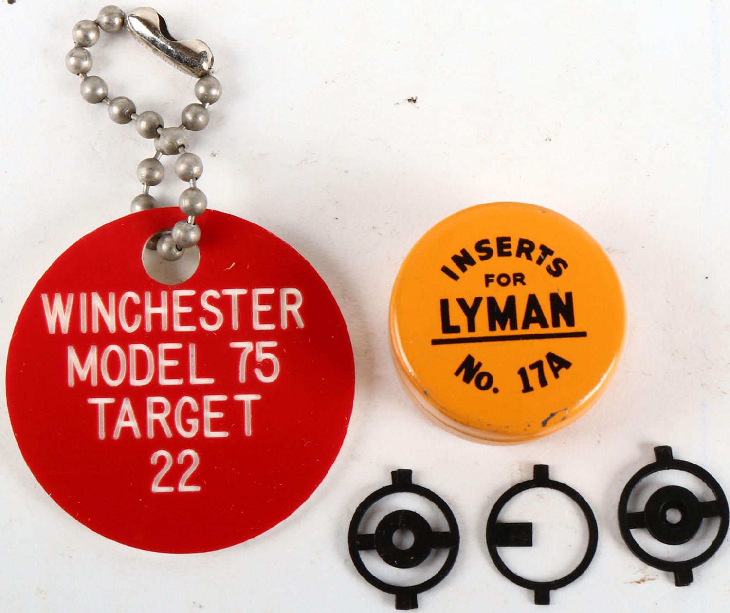Lot of 3 Lyman 17A front sight discs for a Winchester Model 75 & a plastic hang tag for same rifle. Grade: Excellent - Value: 20 to 50