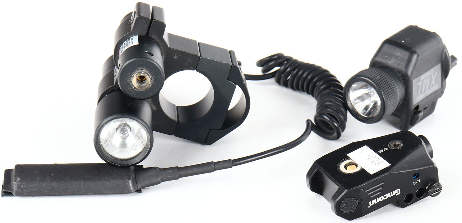 Lot of tactical lights for guns, one has pressure button. Grade: Excellent - Value: 20 to 200