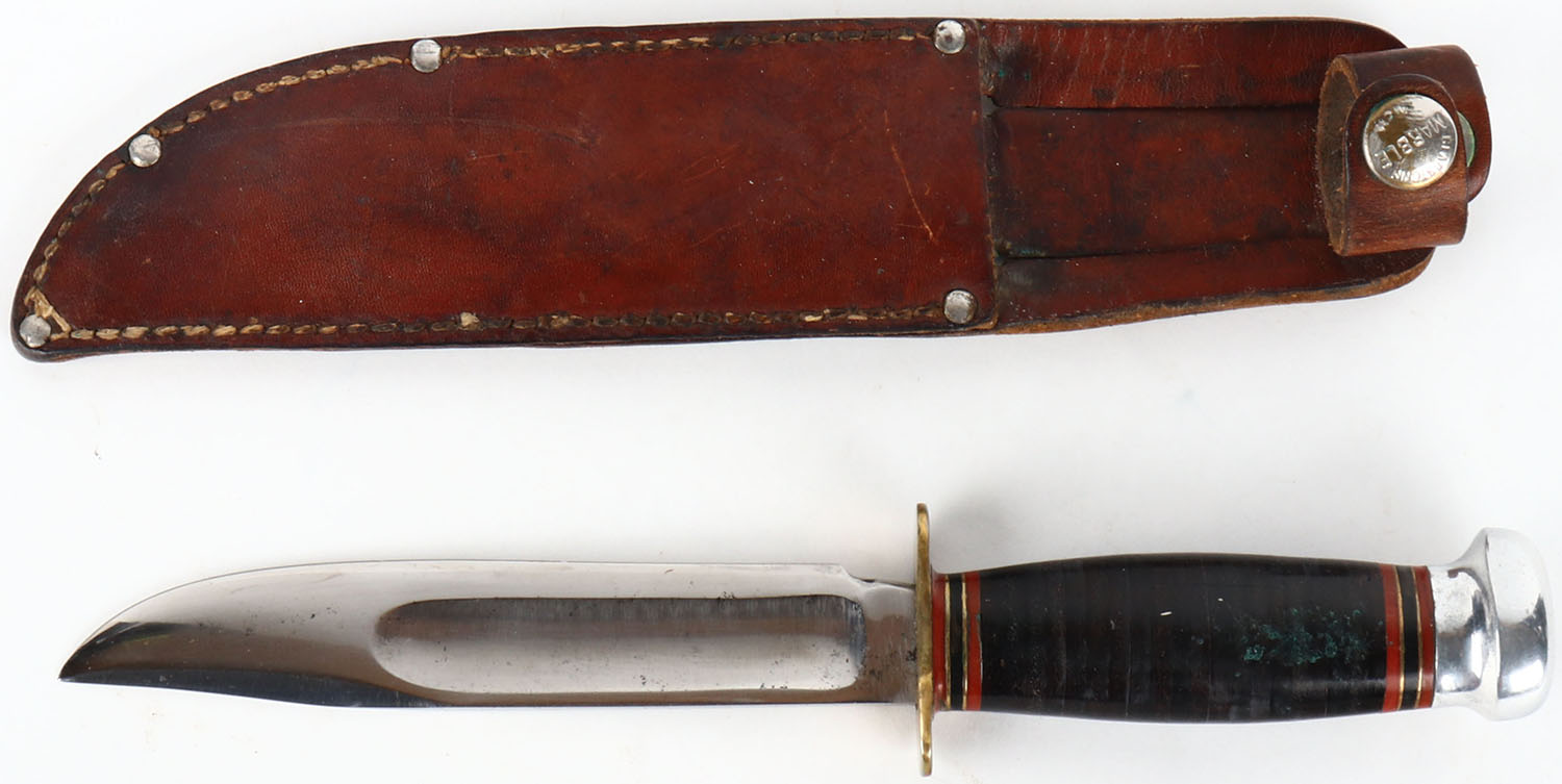 Marble's Knife, 5'' blade, full hilt, aluminum pommel, leather washer handle, has Marbles marked leather sheath. Grade: Very Good ++ - Value: 30 to 100