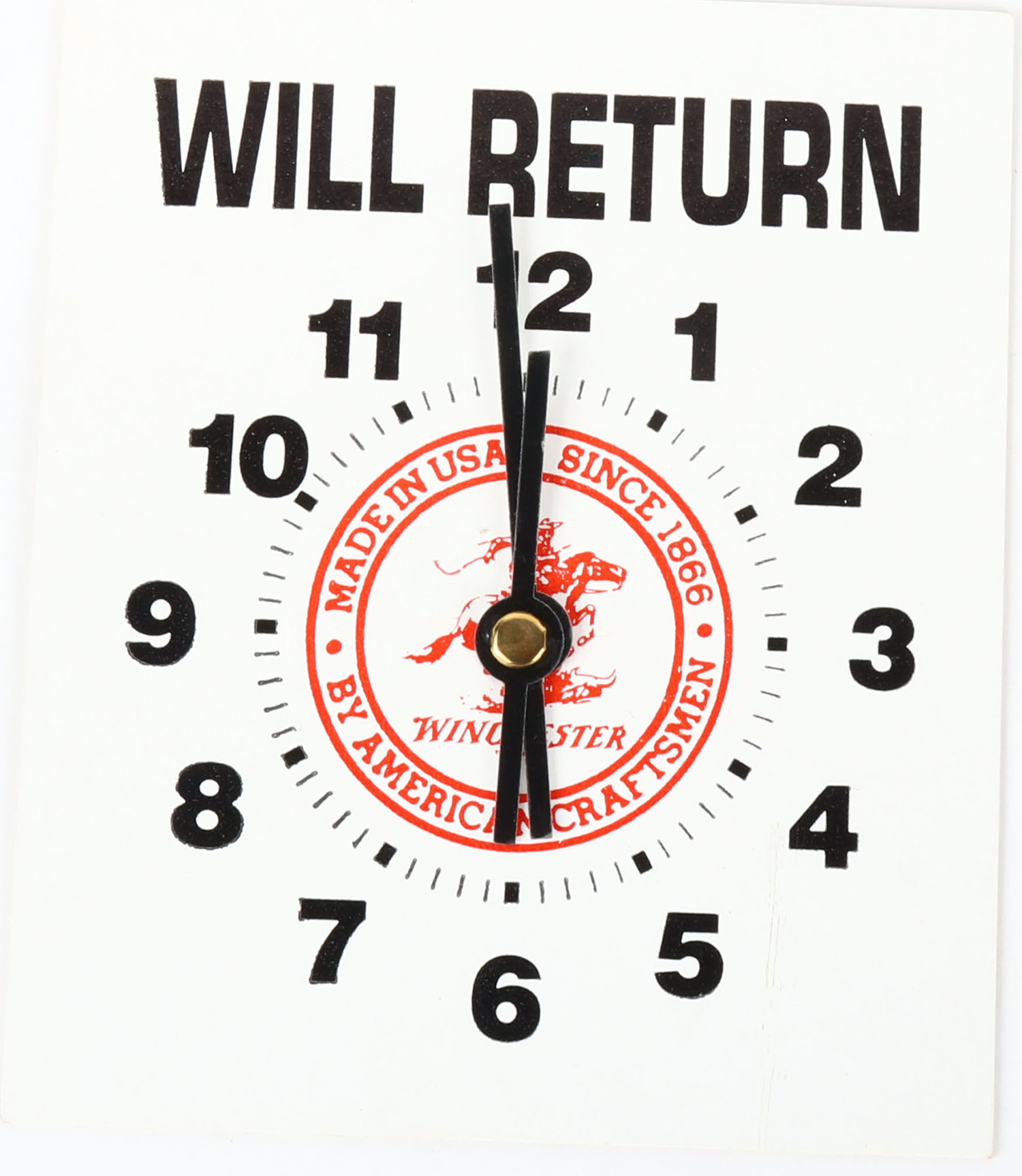 Winchester ''WILL RETURN'', clock for business, 5 1/2'' x 6 1/2''. Grade: MINT - Value: 6 to 30