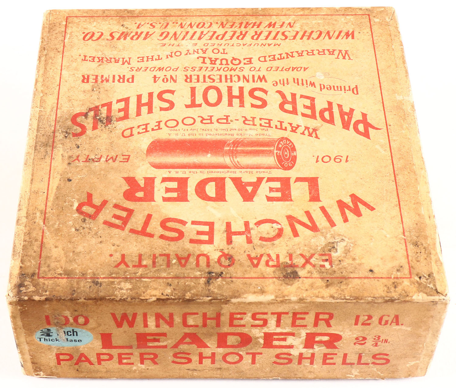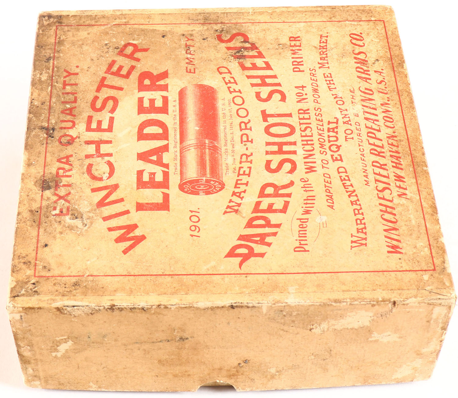 Winchester Leader, 12 ga, 2pc., Full of NPE, 2 3/4'', buff box with buff and red label, box has age soiling, light edge wear, with some scuffing, Shells are excellent. Grade: Very Good ++ - Value: 200 to 500