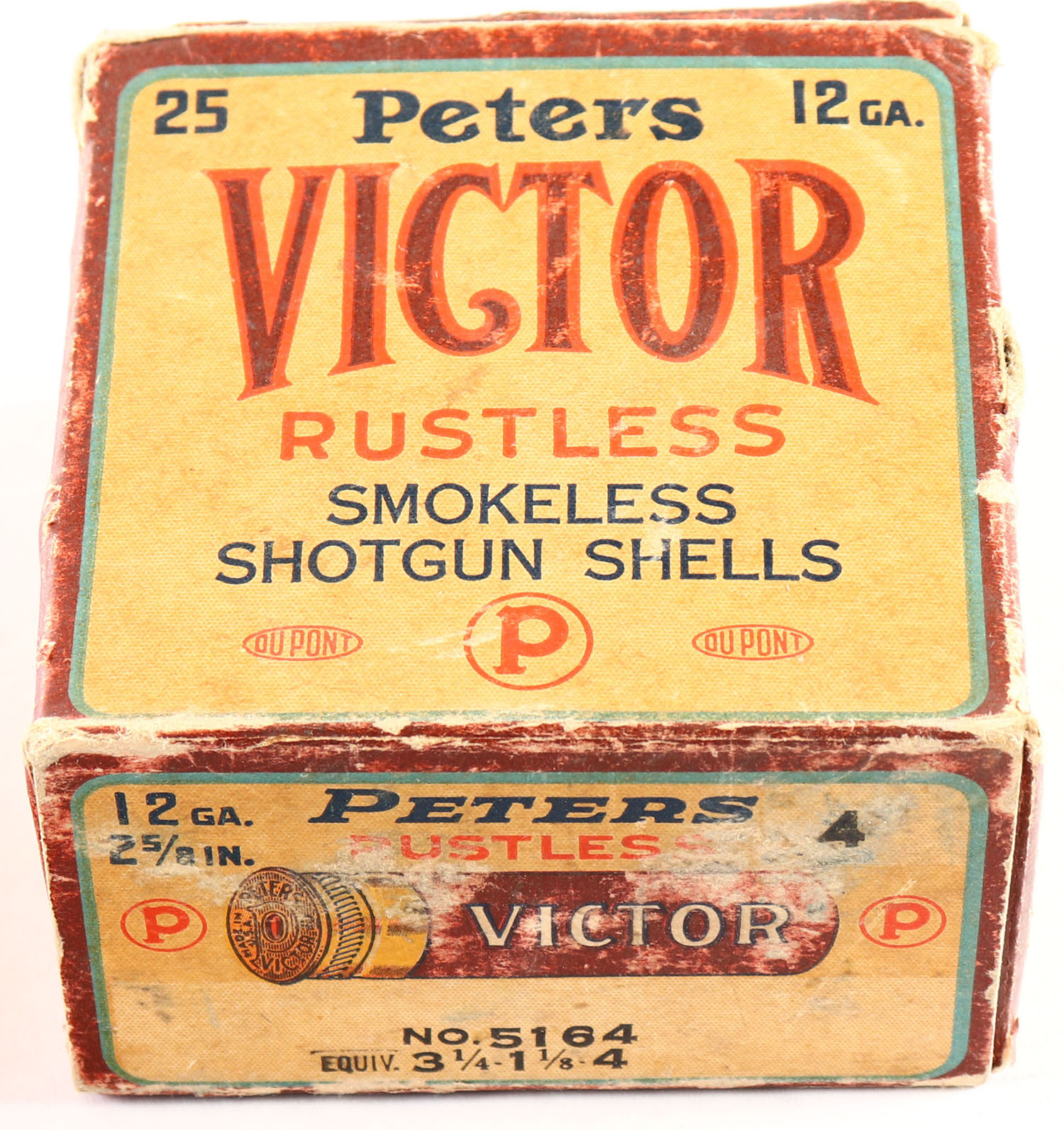 Peters, Victor, Rustless, 12ga, 1pc., Full, shot size 4, Maroon, cream & orange box, 2 5/8'', box is solid, box has age soiling with edgewear, shells are very good. Grade: Very Good - Value: 20 to 50
