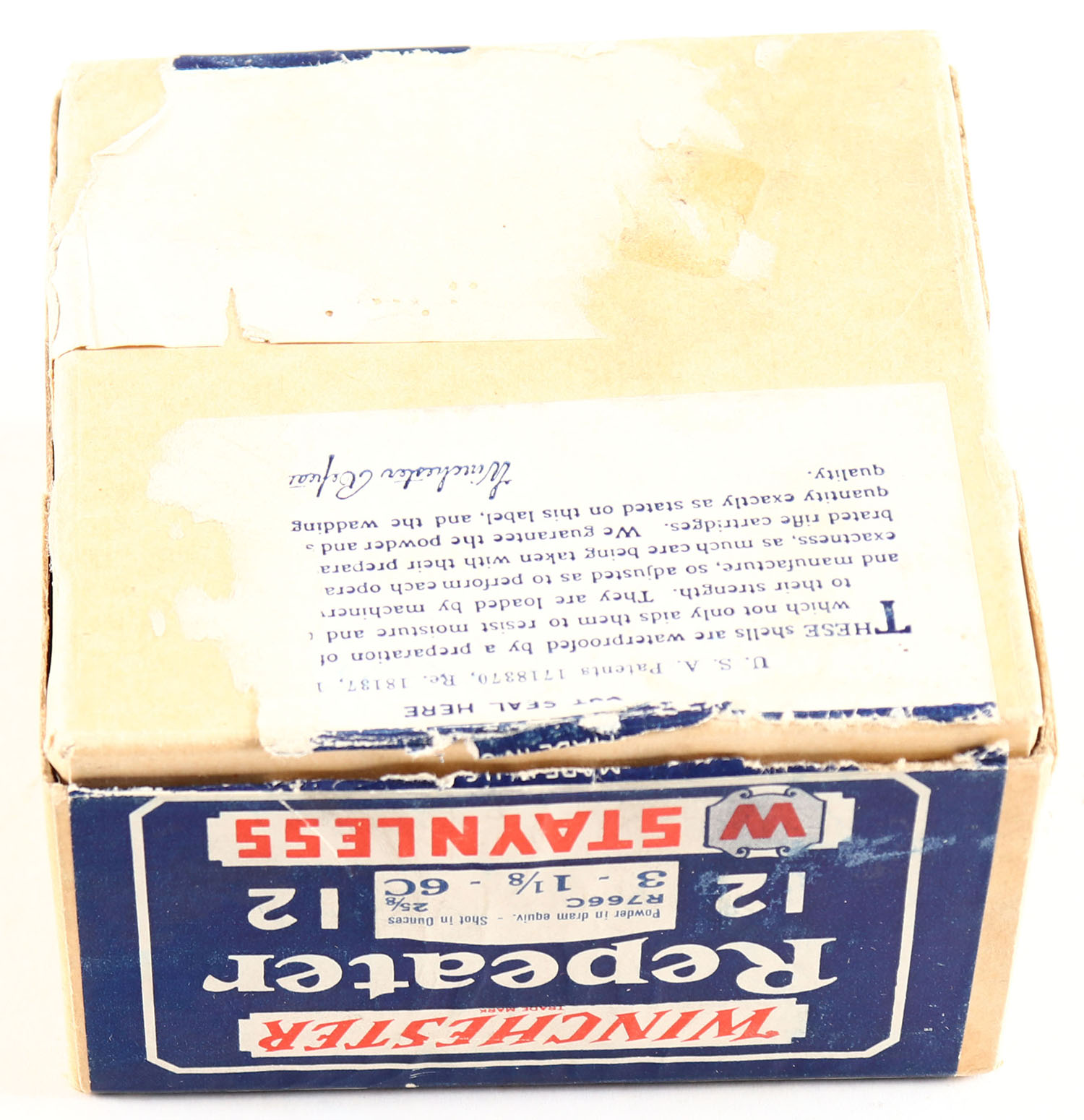 Winchester, Repeater, STAYNLESS, 12ga., 2pc., Empty., shot size 6C, buff box with blue, red & white label, box is very solid. Grade: Excellent ++ - Value: 20 to 80